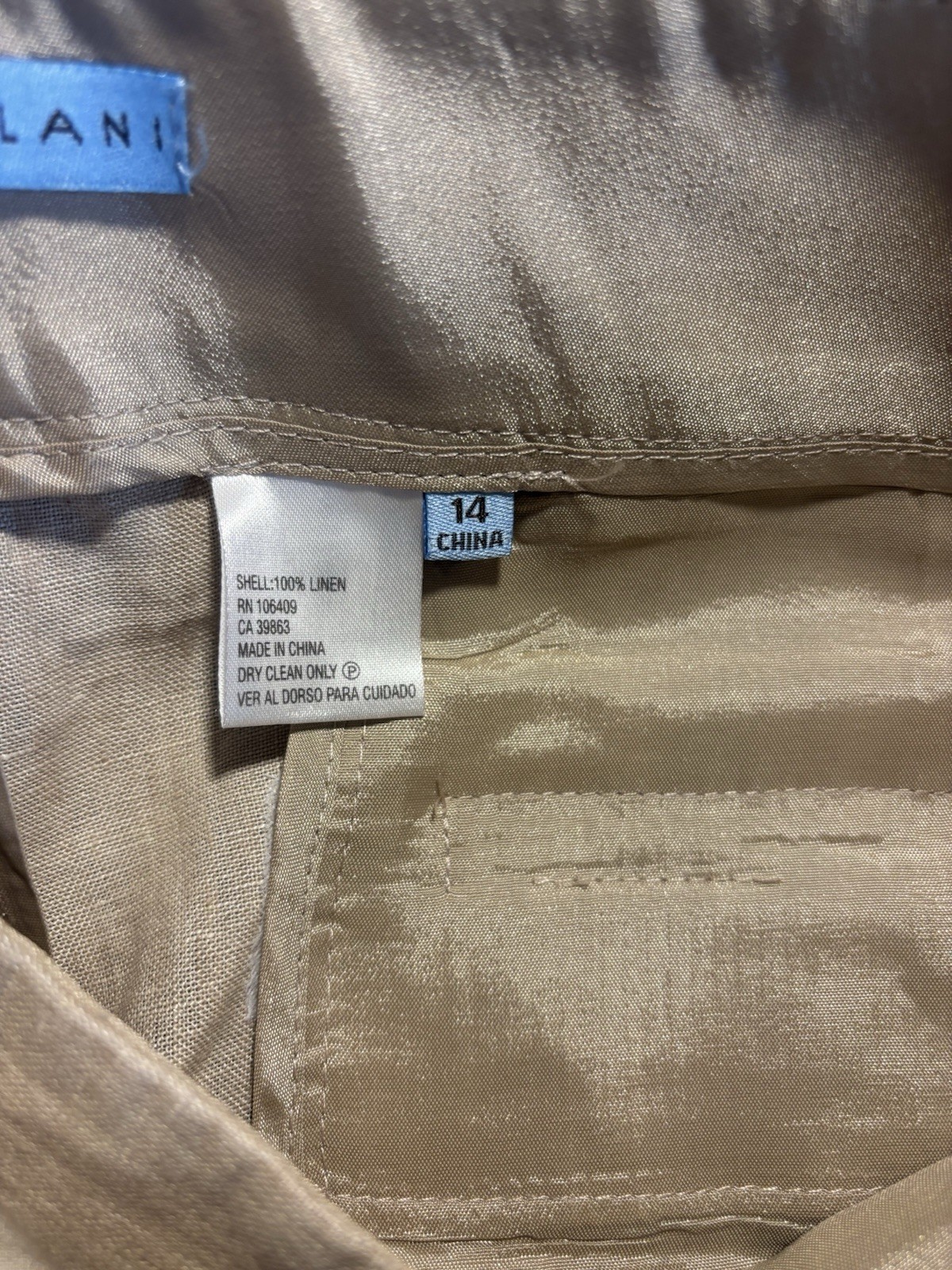 The Antonio Melani Wide Leg Linen Pants in size 14 are a stylish and versatile addition to any woman's wardrobe. These beige pants feature a solid pattern with a zip, hook & loop, and button closure. Made from linen, they offer a comfortable fit with a mid-rise waist and a regular fit. The wide-leg design adds a touch of elegance, making them perfect for both summer and spring outfits. With a flat front and a length of 30.5 inches, these dress pants from the brand Antonio Melani are a classic choice for any occasion.