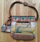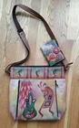 Anuschka Handpainted Leather Crossbody Pocketbook & Wallet Kokopelli Fertility. Condition is preowned. Shipped with Ground Advantage. Great looking bag and matching wallet in very good condition. No rips, holes, or repairs. There is some very light wear on the corners of the bottom of the bag per the photos. The wallet has not been used. The size measures inches in length of 13 inches by 12 inches in height. The strap is adjustable. Thanks for looking at this bag and Happy Shopping!