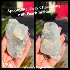 This unique combination of Apophyllite, Grey Chalcedony, and Peach Stilbite Zeolite forms a powerful triad of spiritual energies, harmonizing the mind, heart, and spirit. Together, they create an energy of serenity, intuition, and deep emotional healing, making this mineral specimen a beacon of tranquility and spiritual growth. Apophyllite is a crystal that’s usually clear, white, yellow, pink, green, brown or violet in color. It can also be transparent or opaque. Although this crystal is not widely known, it is, in fact, widespread in all parts around the world. It can be found in various formations, often in volcanic sites around other minerals. Zeolite is a complex mineral which forms in the contact of volcanic lava and water. This process can take thousands or even millions of years; scientists estimate that the first zeolite minerals formed over 300 million years ago. Stilbite is a sodium calcium hydrous aluminum silicate that is a member of the family. This mineral crystallizes in the form of thin flattened plates, tabular crystals, as well as aggregates. Its commonly found in association with Apophyllite and Heulandite within basalt and other volcanic rock. From India. 100% genuine gemstone, variations of size, shape and color are expected. Approx. 139g 3 x 1.5 x 1.25 Metaphysical Properties Apophyllite (Clarity and Spiritual Connection) Apophyllite is known for its high vibrational energy, promoting clarity of thought, intuition, and spiritual awakening. It acts as a conduit between the physical and spiritual realms, enhancing meditation and deepening your connection to higher consciousness. This crystal radiates calming energies, clearing away mental fog and encouraging a state of peace and balance. Grey Chalcedony (Calm and Inner Stability) Grey Chalcedony carries a soothing energy that promotes emotional balance and inner harmony. Known for its nurturing qualities, it helps release self-doubt and encourages resilience in times of emotional turmoil. This stone’s grounding properties pair beautifully with Apophyllite's spiritual energy, creating a bridge between the higher realms and the Earth. Peach Stilbite (Gentle Emotional Healing and Joy) Peach Stilbite is a stone of love, compassion, and gentle emotional release. It helps heal emotional wounds and fosters an uplifting sense of joy and self-acceptance. Its energy is warm and supportive, promoting relaxation and a deeper understanding of your inner self. Combined Energies of the Specimen Emotional Healing : The Peach Stilbite gently soothes emotional distress, while Grey Chalcedony stabilizes and grounds your emotions. Spiritual Clarity : Apophyllite enhances your intuitive abilities, encouraging spiritual insights and connection to the divine. Stress Relief : The calming combination of these crystals creates a serene energy field, helping to reduce stress and foster inner peace. Balanced Energy : Together, these minerals harmonize the mind, body, and spirit, promoting a holistic sense of well-being. Why Add This Specimen to Your Collection? Meditative Support : Perfect for use during meditation to enhance focus, spiritual connection, and relaxation. Emotional Balance : A beautiful tool for navigating life’s challenges with grace and resilience. Decorative and Energetic Uplift : Its natural beauty brings both aesthetic value and high vibrations to your sacred space. This Apophyllite and Grey Chalcedony with Peach Stilbite Zeolite specimen is more than a mineral; it’s a harmonious blend of energies that invites calm, spiritual growth, and emotional healing into your life.