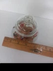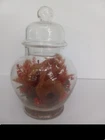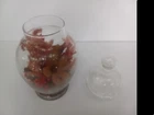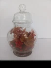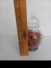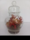 Apothecary Jar with Red tones of Dried Flowers Arranged Inside Vintage 70's. Approximately 8 in. tall. just under 4 in. wide on the largest part. Lid has little ball top. No Chips. E6