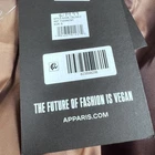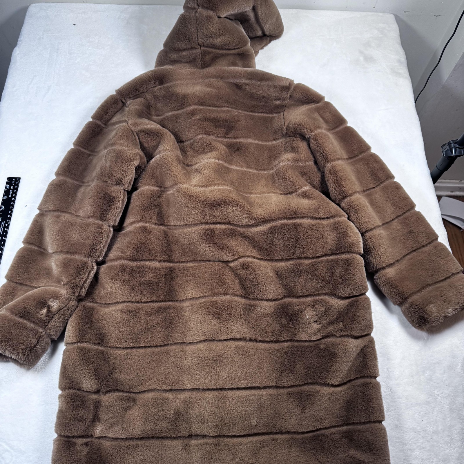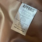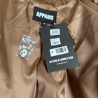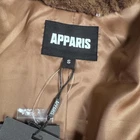 Brand: Apparis Style: Celina 3 long faux fur hooded coat with horizontal plush panels and hidden snap front closure. Color: Brown exterior with a coordinating satin-look brown lining. Gender: Womens Size on tag: Small (S) Materials (per care label): Main fabric faux fur 100% polyester; lining 100% polyester. Details: Attached hood, soft vegan faux fur shell, smooth full lining, front hand pockets, snap button closures, spare snaps/hardware included on hang tag, Apparis logo interior label, slogan on hang tag reads "THE FUTURE OF FASHION IS VEGAN." Care: Dry clean only. Style/Model information from hang tag: Style Name Celina 3; Ref: F22096GM1; Nordstrom tag present. Barcode numbers on hang tag: UPC: 194607001272; additional barcode: 823558238.
