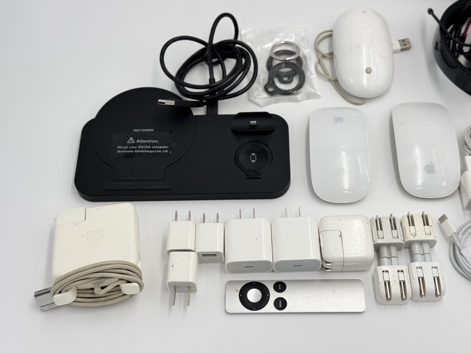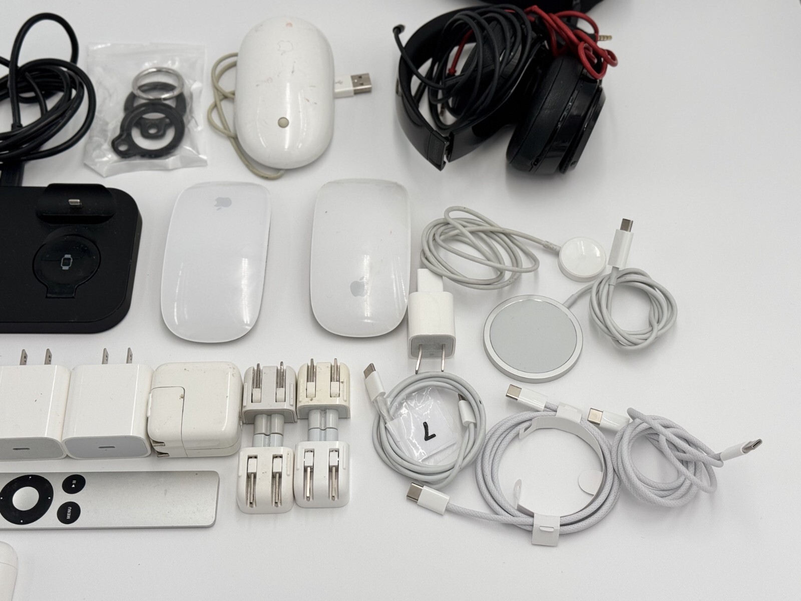 Grab this incredible bundle of genuine Apple products and accessories, perfect for Apple enthusiasts or resellers! What's Included: 2x Apple Magic Mouse (used, tested working) 2x Apple AirPods (used, working condition) *Airpod Pro only contains One left Bud Genuine Apple MagSafe Charger (working) Apple Watch Charging Cable (genuine) Apple MacBook Power Adapter (authentic Apple product, works great) 6x Apple USB Power Adapters (authentic, various wattages) Apple Remote (Older Generation) (functional) Beats Wired Headphones (used, includes carry pouch, fully functional) 3-in-1 Charging Stand (third-party, tested working) USB-C Cables (3 cables total, genuine Apple) Airtag Cases Condition: All items are pre-owned with some visible wear but have been carefully tested for functionality. Items need to be sanitized and cleaned for immediate use. Please see photos for detailed condition. Fast and Safe Shipping! Don't miss out on this value-packed lot of Apple gear!