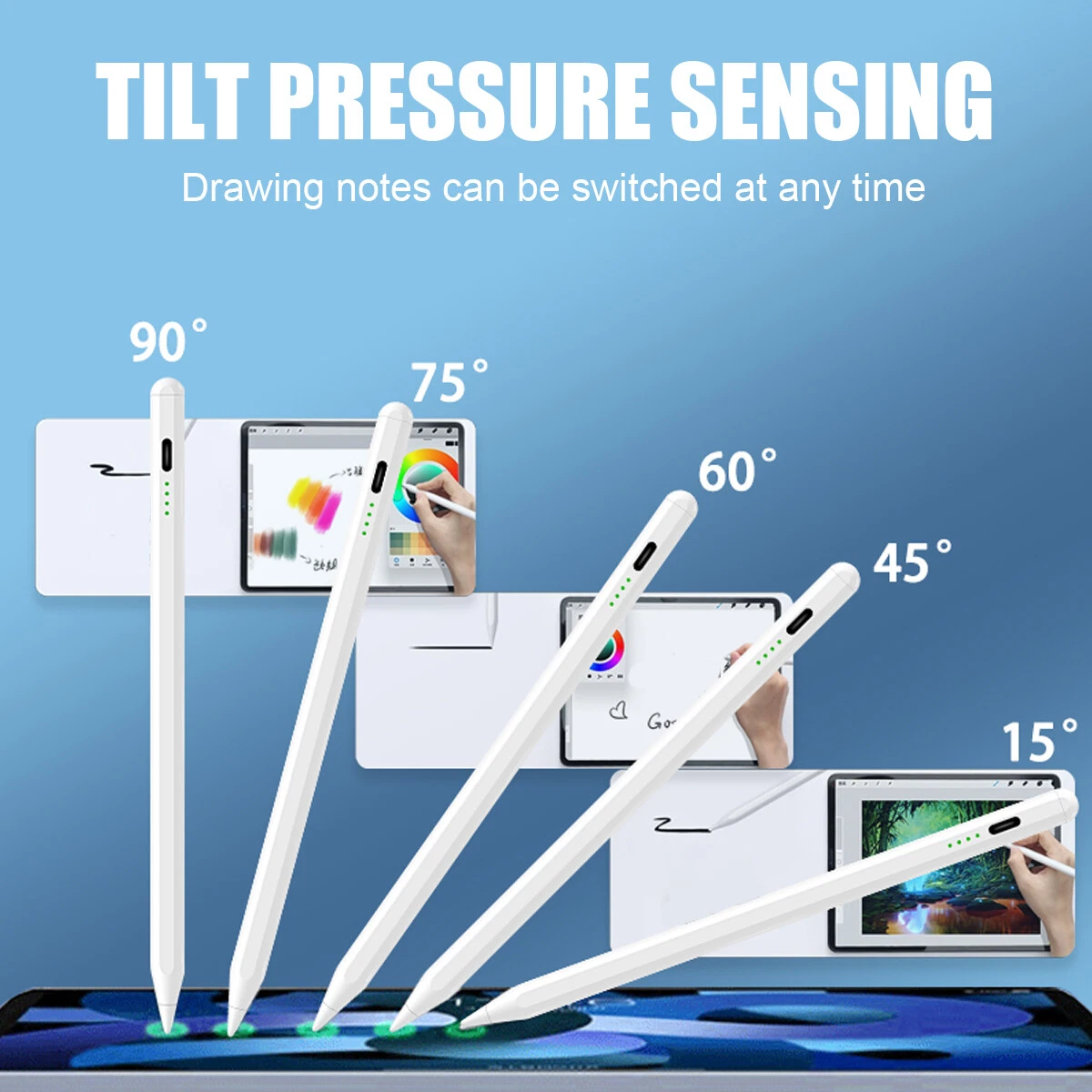 eBay eBay Product Description Description: If you are someone curious about or in need of a stylus pen for drawing, writing, or note-taking, this is an excellent value at its price. This stylus pen with lndicator light and smart touch switch, can be rechargeable by Type-C cable.Our Pencil comes with 1 durable and usable, removable & replaceable pentips which made of high quality POM materials,friendly to your iPad screen and easier to replace. No scratching the screen, no lag, no skipping, and more freedom and naturally to write and working.Take it as the gift to your love, family members.It won't let you down. Feature: 【 Compatible with iPad Models 】 This stylus pen compatible with 2018-2022 iPad & iPad Pro. Such as for iPad Pro 6th/5th/4th/3rd,iPad Air 5th/4th/3rd,iPad 10th/9th/8th/7th/6th,iPad Mini 5th/6th.Not compatible with 2017 and earlier Apple iPad, and also does not support for Android, Microsoft devices. Please confirm whether your model is compatible before buying. 【 Smart Touch Operation & Extra Long Standby 】 No Need Bluetooth or any Apps.Double touches on the top to start or stop the stylus pencil.Built-in 1 00mAh, battery provides 8 hours active use and long standby time, for only 20 minute charging by a USB-C cable. 【 Stylus Pen With Palm Rejection 】 You can rest your palm comfortably on the screen when writing or drawing by the upgraded active pencil with palm rejection. No need to wear gloves. This technology provids you with a more smoother,naturaller writing/drawing experience. 【 Magnetically Attach 】 This rechargeable stylus pen can be attached to the side of iPad by the powerful magnetic, but does not support magnetic charging. More portable, easier to organize,No more rolling and lost. 【 Perfect Precision 】 This Stylus Pen for iPad has an ultra-fine 1.5mm tip which allows precise strokes and easier to write small characters. No scratching the screen, no lag, no skipping. Not easy to break! Compatible Models: Stylus Pen Compatible with apple iPad (6th,7th,8th,9th,10th generations) It compatible with iPad 10th (10.2-inch) A2696/A2757/A2777 It compatible with iPad 9th (10.2-inch) A2602/A2604/2603/2605 It compatible with iPad 8th(10.2-inch) A2270/A2428/A2429/A2430 It compatible with iPad 7th(10.2-inch) A2197/A2198/A2200 It compatible with iPad 6th (9.7-inch) A1893/A1954 It compatible with iPad Pro 3 (11-inch ) A1980/A2013/A1934/A1979 It compatible with iPad Pro 3 (11-inch ) A2228/A2068/A2030/A2231 It compatible with iPad Pro 3 (11-inch ) A2377/A2459/A2301/A2460 It compatible with iPad Pro 3rd (12.9-inch) A1876/A2014/A1895/A1983 It compatible with iPad Pro 4th (12.9-inch) A2229/A2233/A2069/A2232 It compatible with iPad Pro 5th (12.9-inch) A2378/A2461/A2379/A2462 It compatible with iPad Mini 5th (7.9-inch ) A2133/A2124/A2126/A2125 It compatible with iPad Mini 6th (8.3-inch) A2567/2568/2569 It compatible with iPad Air 3rd (10.5-inch) A2152/A2123/A2153/A2154 It compatible with ipad Air 4th (10.9-inch) A2316/A2324/A2325/A2072 NOTE: If your iPad Bluetooth connection uses the Apple Pencil, please clear the Apple Pencil from the Bluetooth list and turn off the Bluetooth function. This will prevent the stylus from being used with the iPad. Specification: Material: Aluminum Alloy Color:White Pencil Diameter Size: 9mm Pencil Nib Size:1.5mm Pencil Length: about 16.5cm/6.5" Charging Port:USB-C Battery Capacity:140mah Charging time: 20-30 minutes Charging head use: 5V 1A or 5V 2A (Do not use high power fast charger, will burn out) Continuous Working Time: 4-8 hours Compatible with most notes & drawing software in the APP Store. Indicator light introduction: When charging: display the current power level and blinking Fully charged: all four lights on When working: green light and display the current battery level Power saving mode: 30 minutes without use automatically switch off Package Included: 1* Stylus Pen 1* Replacement Tips 1* USB C Charging Cable 1* User's manual 1* Storage Box