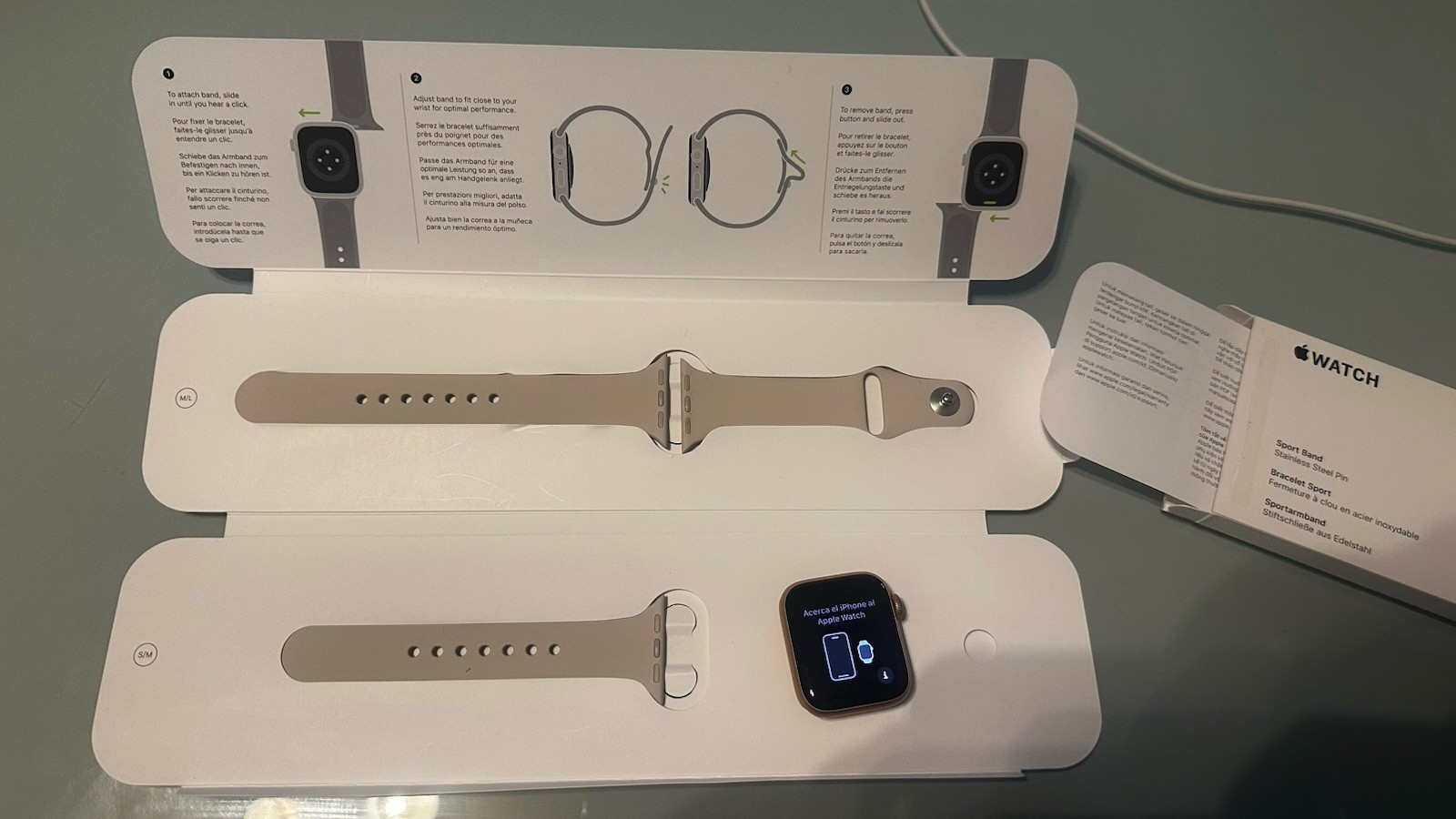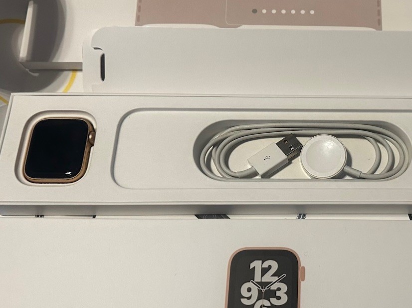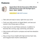 The Apple Watch SE GPS (1st Gen) in 40mm Gold Aluminum Case with Starlight Sport Band is a sleek and stylish smartwatch from Apple. With features like E-compass, altimeter, GPS, and heart rate monitor, this watch is perfect for fitness enthusiasts and outdoor activities. The gold aluminum case and starlight band add a touch of elegance to the device, making it a versatile accessory for any outfit. With 32GB of storage capacity and compatibility with iOS, this Apple Watch offers convenience and functionality in one compact package. Open box purchase. Charged and ready to pair.