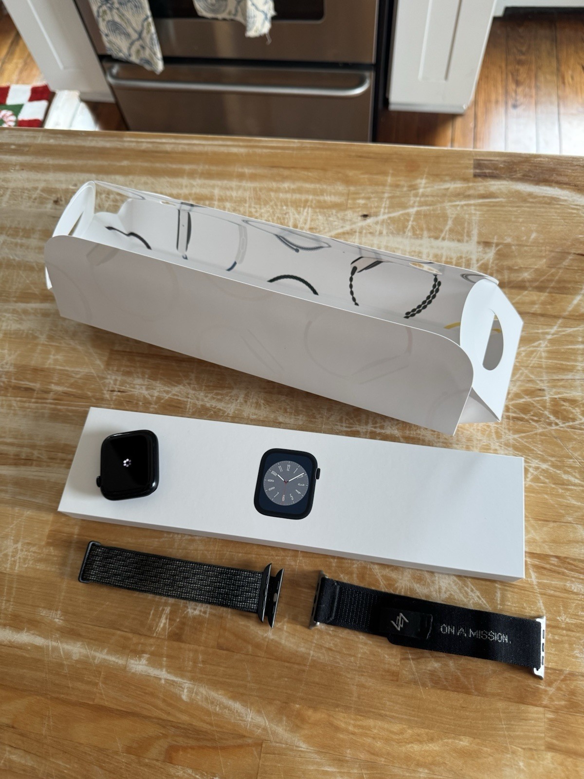 The Apple Watch Series 8 45mm Aluminum Midnight Unlocked is a sleek and powerful smartwatch by Apple. With a stylish black aluminum case and matching band, this device is perfect for those looking for a combination of fashion and function. The GPS feature allows for accurate tracking of outdoor activities, while the Apple Watch OS ensures smooth performance. This unlocked device is compatible with iOS and comes 2 used velcro watch straps and the original box. No scratches to the glass screen. In great condition!