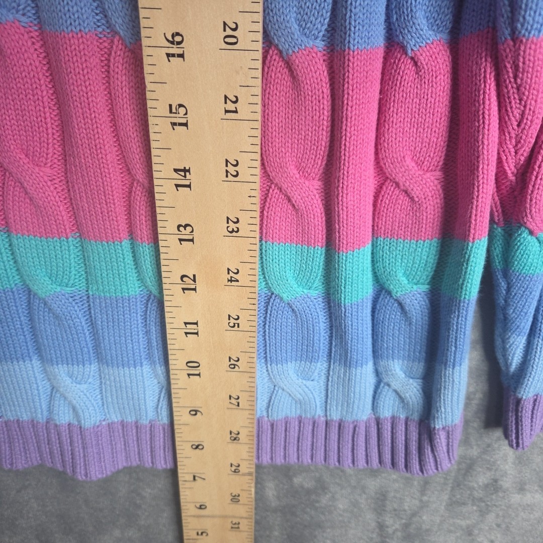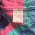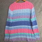 Appleseed’s Petite cable knit cotton sweater – Women’s 1X Gorgeous pastel rainbow stripes – soft and cheerful palette Classic cable knit texture adds timeless charm Made from 100% cotton – soft, breathable, and comfortable Machine washable for easy care | RN 76915 Flattering crew neck and ribbed cuffs/hem Perfect for spring, cool summer evenings, or layered in fall Pre-owned condition