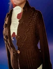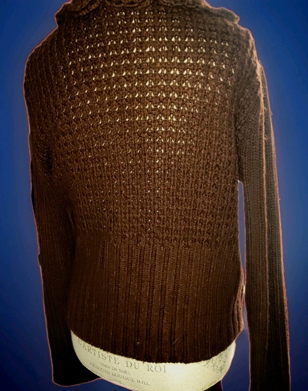 The April Cornell Med Chunky Brown Cardigan Sweater is a stylish and cozy outerwear piece for women. Made from a blend of wool and acrylic, this long-sleeve sweater features an open-knit pattern in a solid brown color. The cardigan has a regular fit and size M, perfect for layering over any outfit. With its floral theme and high-quality knit fabric. Measurements:: Shoulder to hem 22inches Arm pit to Arm pit 17 inches / Arm length from shoulder to bottom cuff 25 inches.