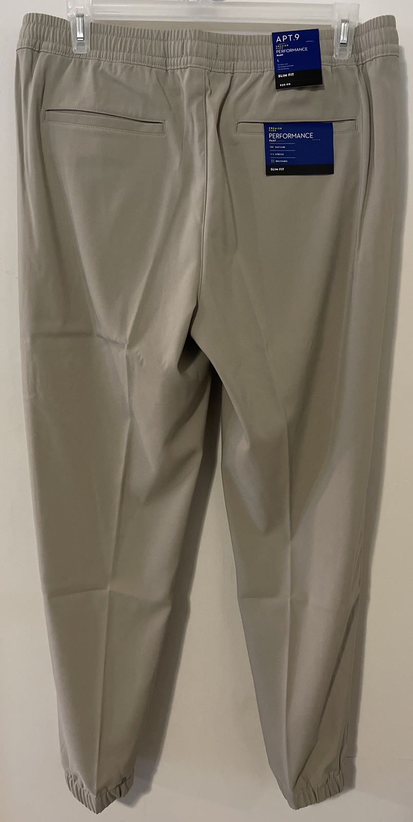 Apt 9 Mens Premier Flex Performance Jogger Style Pants NWT! A4563. This is a super nice stylish pair of slim fit joggers in perfect brand new condition. The inseam measures 30 inches. The material is a polyester spandex blend. The material is an easy flex stretchy material.