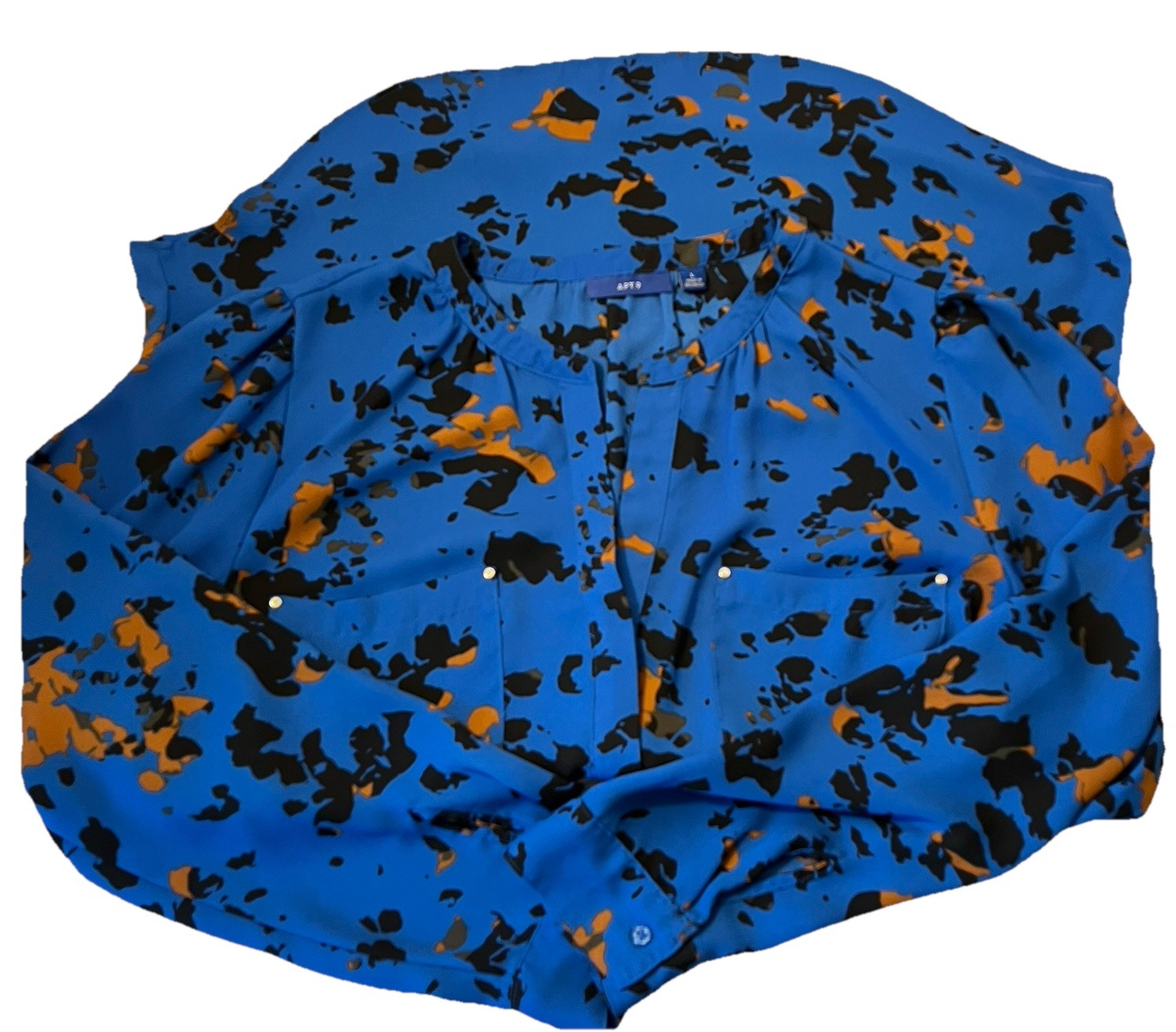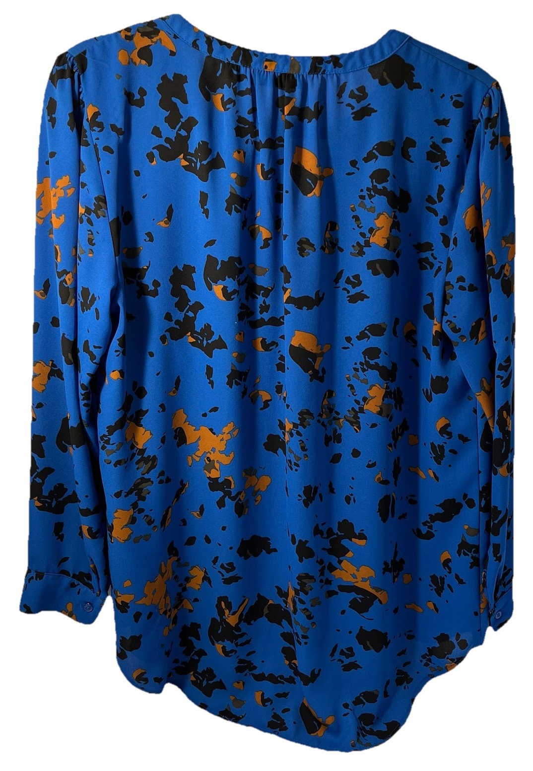 This Apt 9 blouse in size large features a v-neck design with long sleeves and a button closure. The blue color is accented with random splashes of brown and black adding a unique touch to the classic blouse style. Made from lightweight polyester chiffon fabric, this blouse is machine washable and perfect for various occasions including travel, parties, casual outings, and formal events. The regular fit and all-season design make it a versatile and stylish addition to any women's wardrobe. Cuffed sleeve length is 24 inches, chest is 22 inches pit to pit with a length of 30 inches.