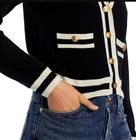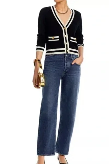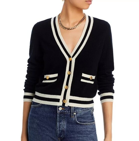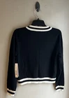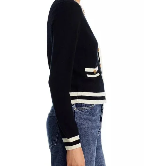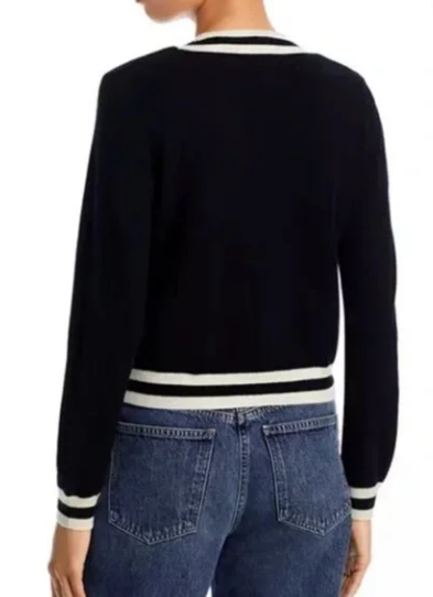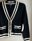 Aqua 100% Cashmere women's Gold Button Cardigan color: Black / Ivory size: Small Deep V-neck Long sleeves Front button placket Waist welt pockets Gold-tone buttons Striped ribbed trim 100% Cashmere retail $198 underarm to underarm 19" shoulder to bottom 20" C61