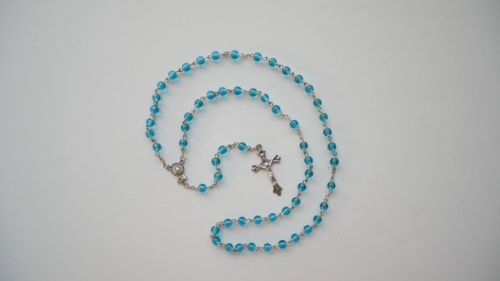 Aqua Beads Pressed Glass Rosary with Pouch Included This is one of the best rosaries you can buy...all glass...heavier than other rosaries. PLEASE NOTE THAT THIS ROSARY IS NOT INTENDED TO BE USED AS A NECKLACE ROSARY AND WE DON'T RECOMMEND TO USE IT AS SUCH. This listing includes (1) rosary. SIZE/LENGTH: Total length is 19" (27" circumference) including the Crucifix. BEADS: Quality 6 mm (1/4") pressed glass round beads carefully assembled on a zinc alloy chain. CENTER PIECE: Zinc alloy center piece of The Madonna measures 5/8" x 3/8" CRUCIFIX: The Crucifix measures 1-1/2" L x 7/8" W. This rosary includes a FREE pouch that may be black or blue. Come Visit Us at Our New Store! Please feel free to email me with questions about this item. Also please check my other listings. I am always available to answer your questions promptly. Buy from us with confidence.