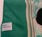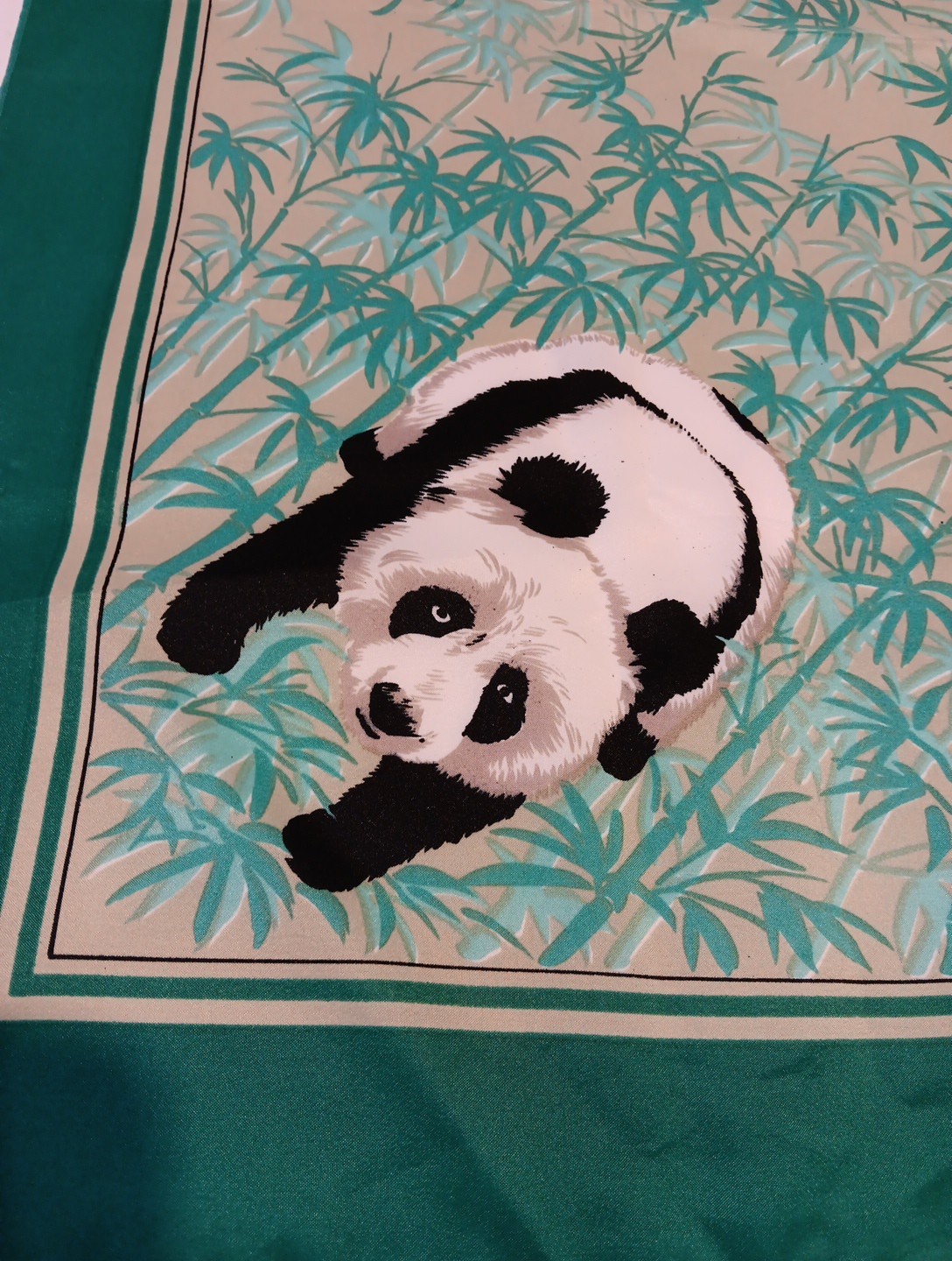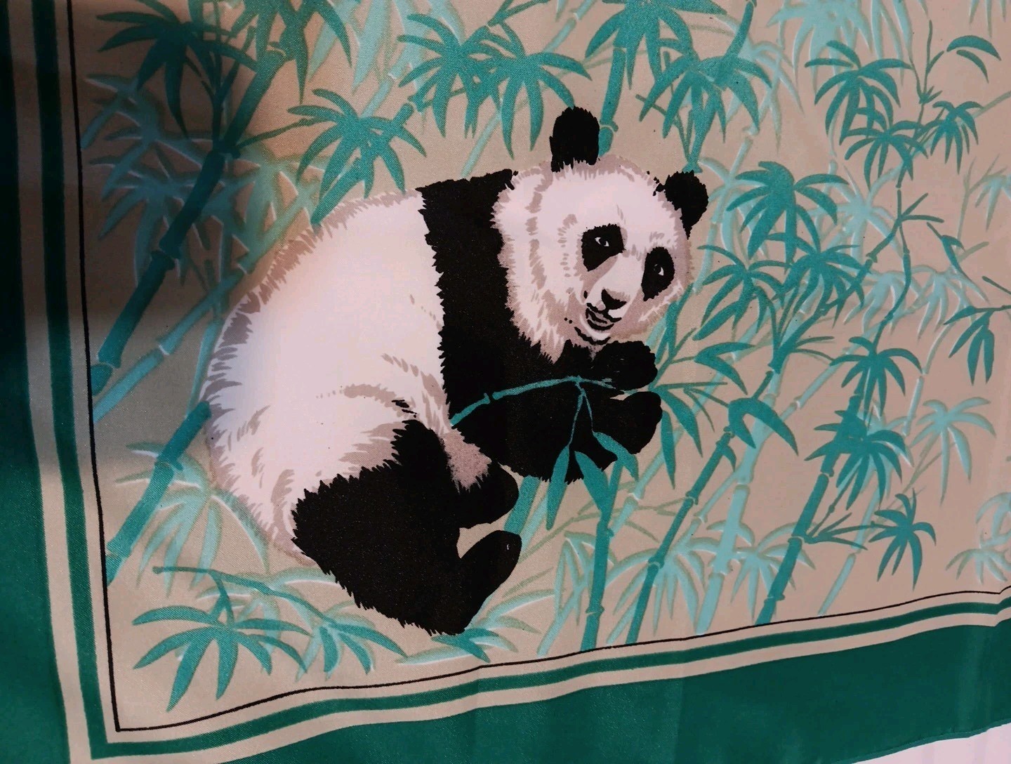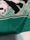 Super cute pre-owned polyester scarf featuring pandas and a bamboo print. The color is an dark aqua kind of green. It measures 29x30 inches. There is a small red stain and a place that looks like a random black mark, which I believe is a manufacturer flaw. Please see photos. It would be cute yo wear to the zoo. Please message me for additional photos or information.