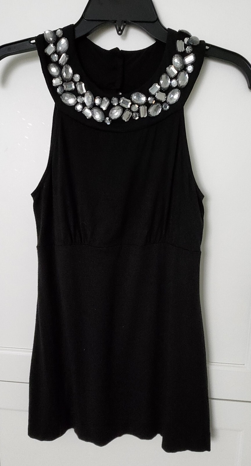 Aqua black sleeveless rhinestone-collar flare blouse (M) BEAUTIFUL! Stunningly Attractive! 3-button closure at back neck Seam across/under bust at front 93% modal, 7% spandex Hand Wash cold (or wash on delicate using laundry bag) Made in USA Underarm to underarm (around) – 32-34” Underarm to bottom/side – 18” Back of neck to bottom – 26” This item comes to you from a smoke free, pet free home.