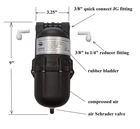 Applications: This Dampener tank should be used with any Aquatec 5800 series demand delivery pumps. 5801, 5802, 5803 Ideal for applications where consistent pressure is required when use in conjunction with booster pump and demand pump. Ice maker pumps, misting pumps, line pressure pumps, etc. Ideal for applications that use pressure switch, level switch, float valve, flow meter Ideal for sensitive applications where water or liquid pressure spikes should be minimized. For food processing equipment, dental chair, humidifiers, misting sprayers, instruments, machines, etc. Aquatec Pulsation Dampener accumulator pressure tank for demand delivery pumps and misting aeroponics booster pump. Dampens pressure switch cycling pulsating issues, limit water hammer. Ideal for ice maker pump, commercial coffee maker, vending machines, float valves, level switches, flow meter, sensitive instrument, food processing equipment, where consistent water pressure is required. Specification Dimension: Length 8.92” Height 4.13” NSF food grade materials Mounting bracket installed (hard rubber material) Max Pressure: 125 psi Pre-charge air pressure: 20 psi Inlet/outlet: Non-directional, no check valve inside, 3/8” JG quick connect, can be converted to other sizes using adapter fitting. Features: Compact design, NSF list food grade material for potable water. Dampens pump switch pressure switch cycling and pulsating. Pump turns on, off, on, off. Limits harmful pressure spikes and water hammer in pipes Provides consistent water pressure. Minimizes hydraulic noise Easy installation and maintain Mounts in any position with included bracket 3/8” JG quick connect fitting for 3/8” OD tubing. Includes two 3/8” to 1/4” reducer fitting for 1/4" OD tubing Compact design, NSF list food grade material for potable water. Dampens pump switch pressure switch cycling and pulsating. Pump turns on, off, on, off. Limits harmful pressure spikes and water hammer in pipes Provides consistent water pressure. Minimizes hydraulic noise 3/8” JG quick connect fitting for 3/8” OD tubing. Includes two 3/8” to 1/4” reducer fitting for 1/4" OD tubing