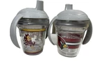 This set of two sippy cups is perfect for your little one who loves to drink in style. Featuring the colors of the Arizona Cardinals and Sun Devils, these cups are made of BPA-free plastic and come with handles for easy gripping. With a capacity of 6 fluid ounces, they are perfect for on-the-go use. The cups are designed with a screw-on lid style and are made in the United States. These sippy cups are a must-have for any baby or toddler who loves sports-themed designs. The cups are durable and easy to clean, making them a great addition to your child's cup collection. Whether you're at home or on-the-go, these cups are sure to keep your child hydrated and comfortable. Note: There are no chew marks on the lids. Please review the photos.