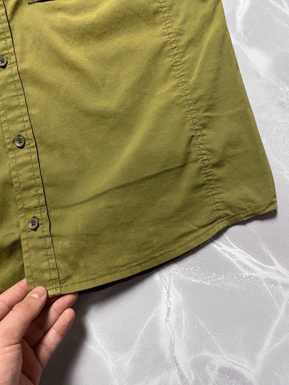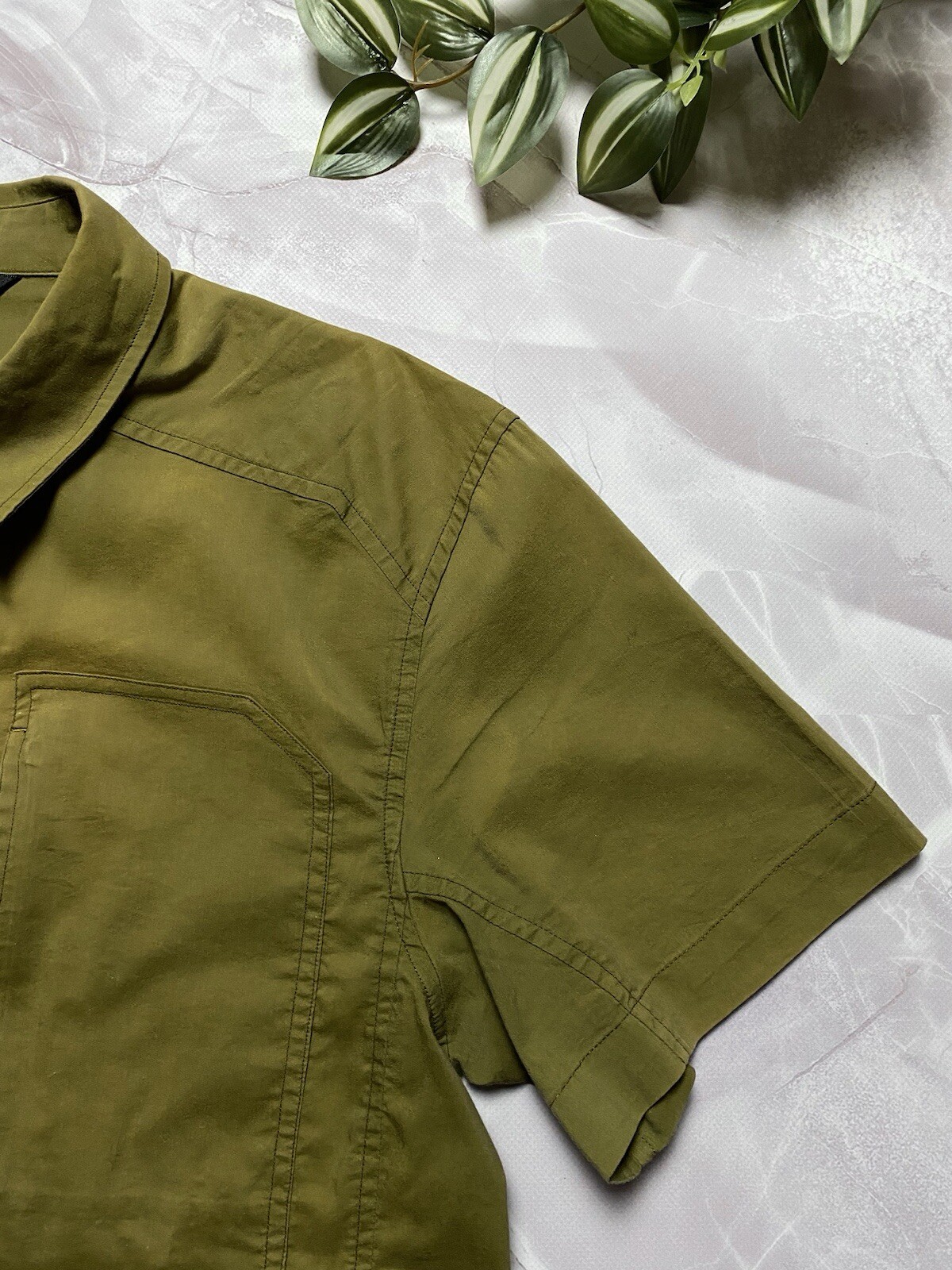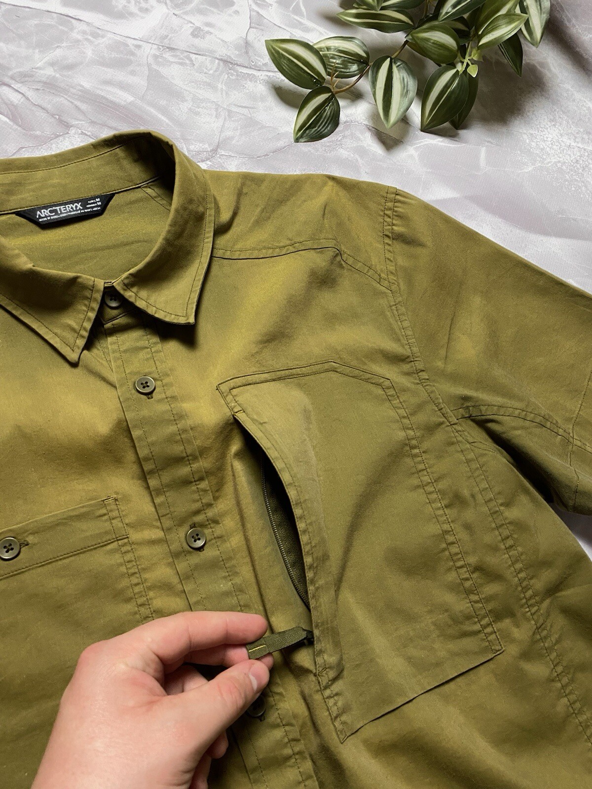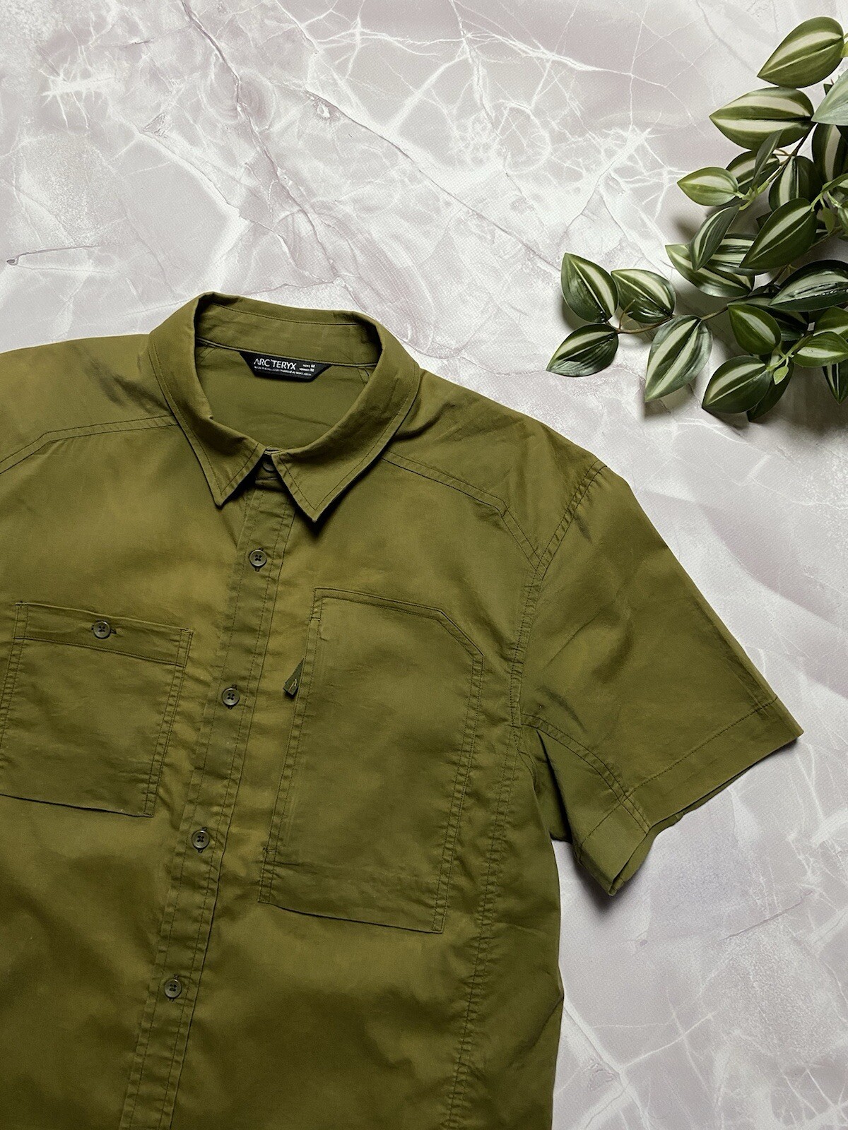 Arcteryx A2B Short Sleeve Button Down Shirt in green Embroidered logo on the back Front pocket with button and zipper closure CONDITION good, color faded in places, but no holes or other damage SIZE M MEASUREMENTS: Shoulders - 48 cm Width (under the armpits) - 54 cm Length (from the neck) - 72 cm