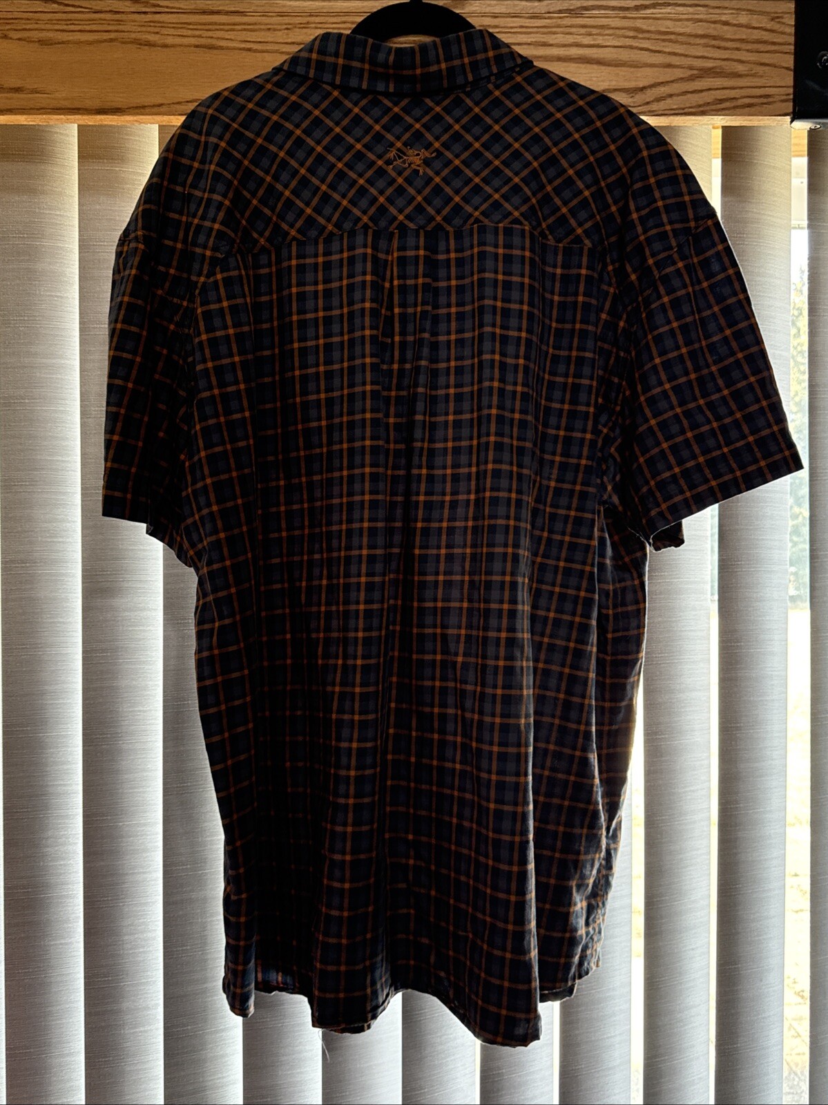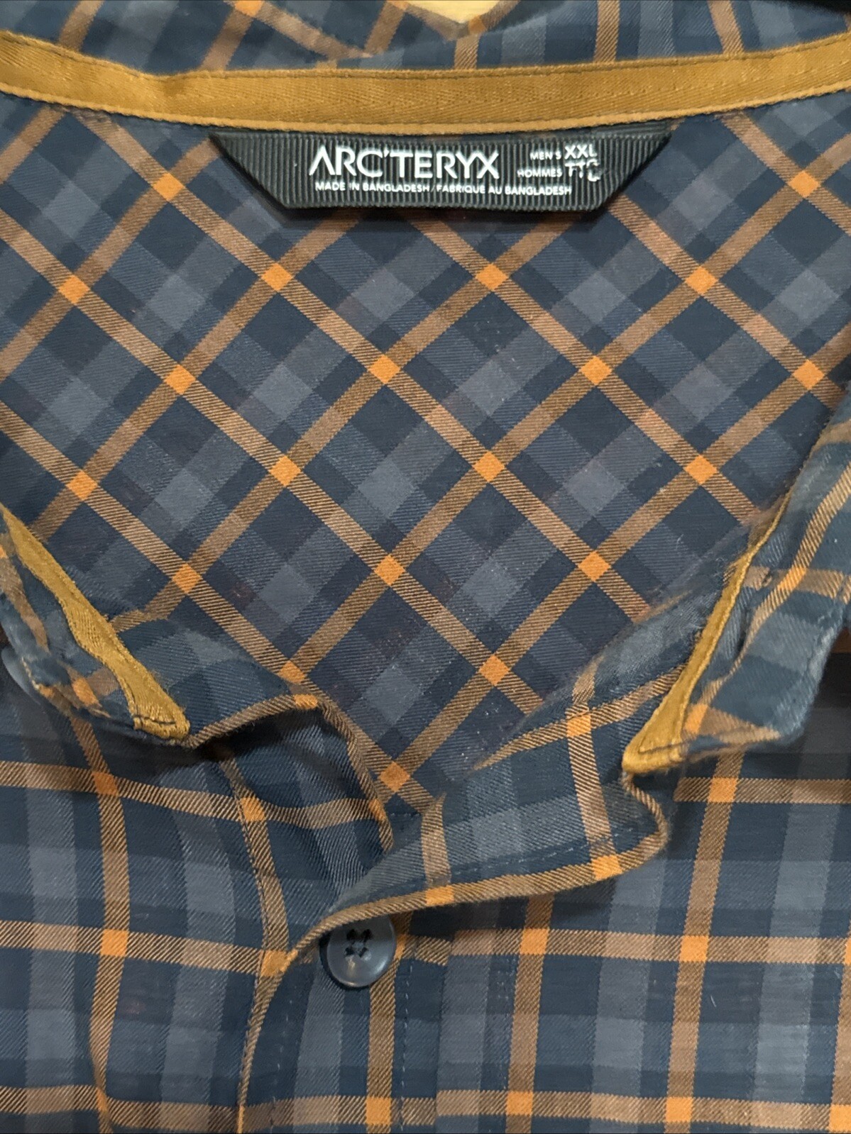 This is a men's Arc'teryx button-up shirt in a blue plaid pattern, with short sleeves and a button-down collar. It is a size 2XL and designed for casual occasions.