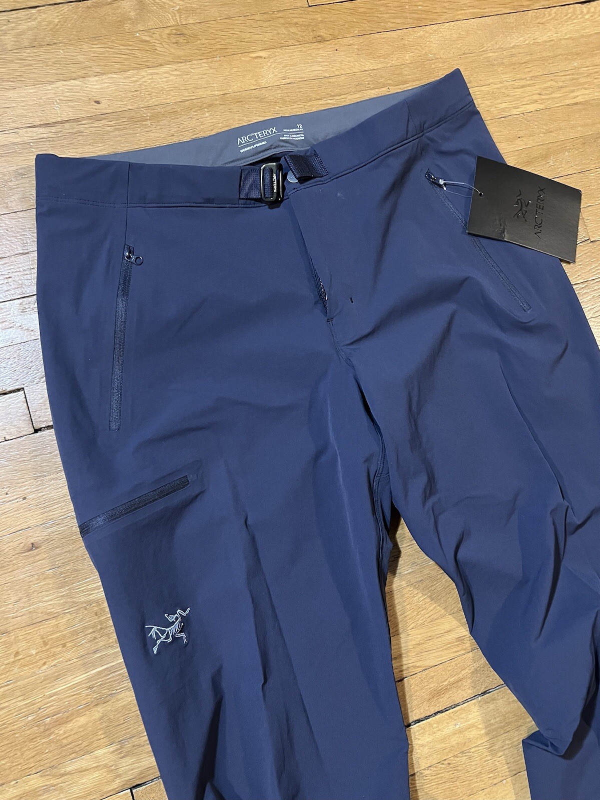 The product is a pair of Arc'teryx Gamma Pants for women in size 12 and a blue color. These pants are designed for hiking and trail activities, featuring a regular fit and a pant style. They are brand new with tags attached, indicating that they have not been previously worn. The Arc'teryx brand is known for producing high-quality outdoor clothing, suggesting that these pants are likely durable and well-suited for outdoor adventures.