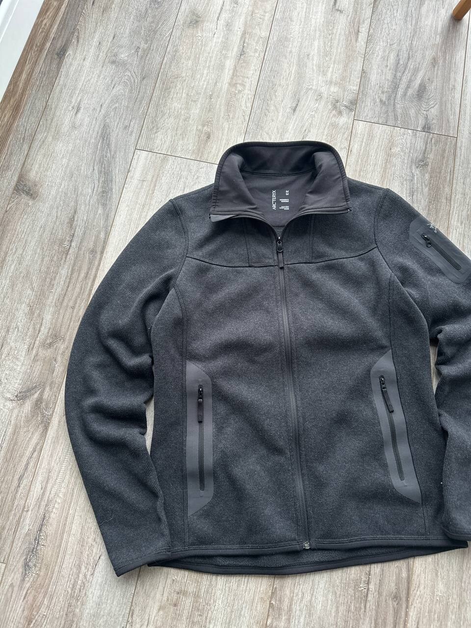 This is a stylish Arc'teryx women's full zip fleece sweater jacket in size medium. It features a check pattern, long sleeves, and a lightweight, breathable design suitable for all seasons. The jacket is accented with a logo and is ideal for various occasions such as travel, parties, workwear, and casual outings. It is designed for a regular fit and is machine washable for easy care.