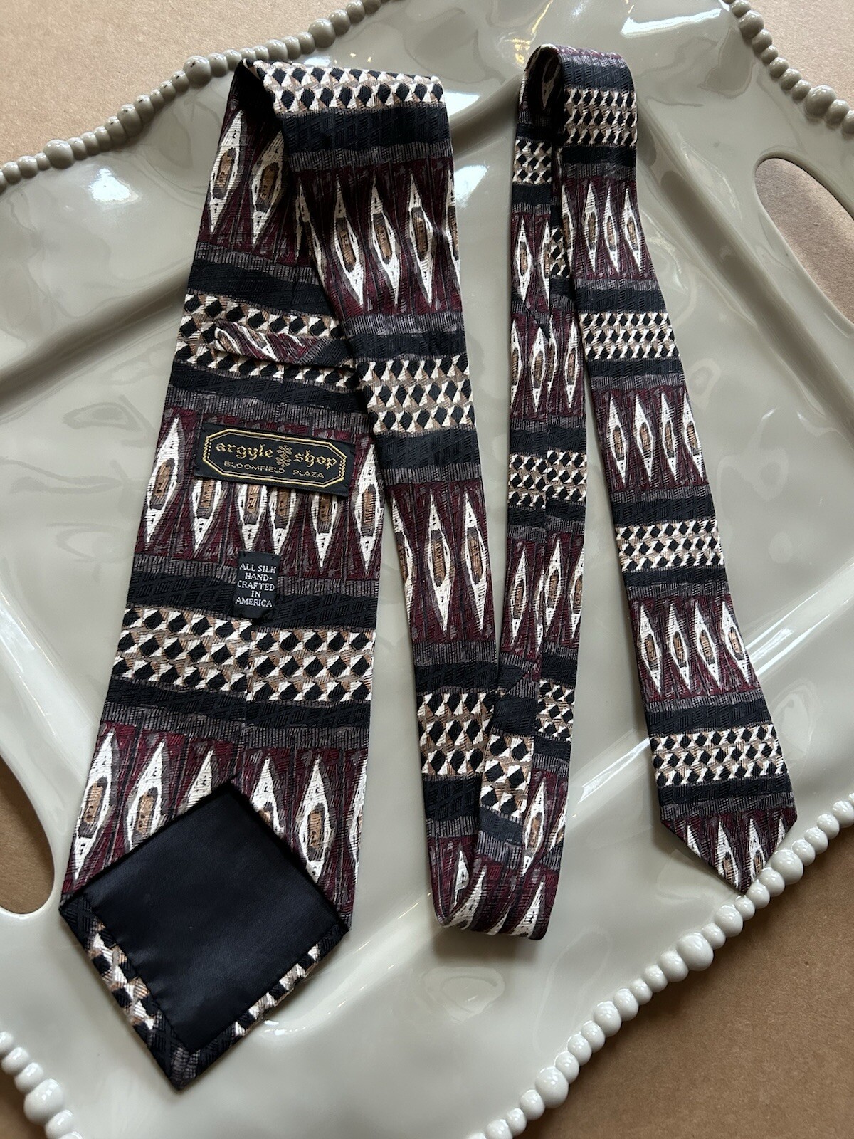 Elevate your sartorial choices with the Argyle Shop's premium necktie, a testament to timeless style and impeccable craftsmanship. The tie features a bold, black and white burgundy geometric pattern, offering a sharp contrast that's sure to make a statement. Crafted from the finest silk, this classic-width HANDMADE tie is designed to provide a perfect knot and a sleek drape, complementing any gentleman's ensemble. Whether for business or a special occasion, this Argyle Shop tie adds a touch of sophistication to your outfit. 4 X 59