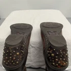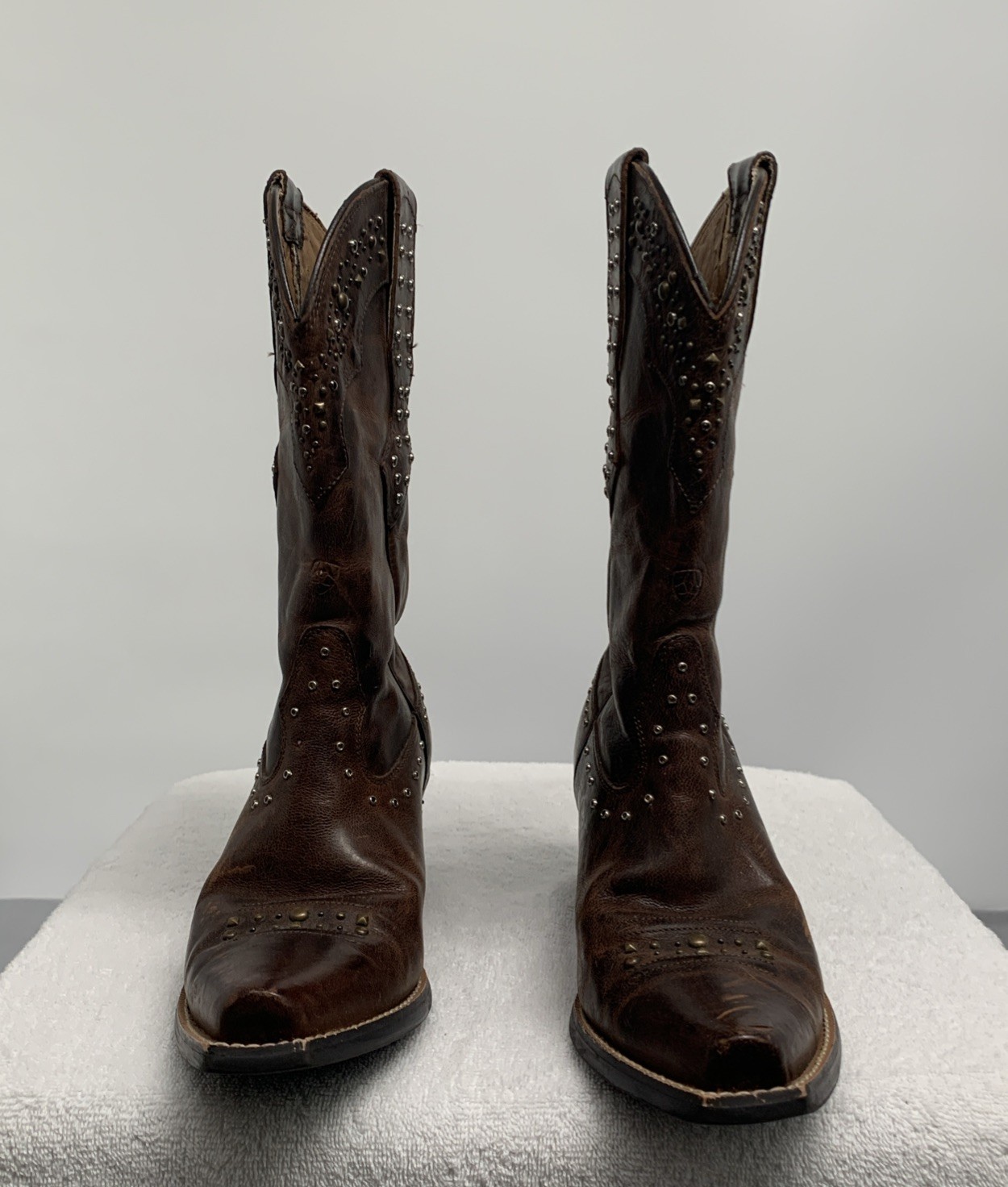 This is a pair of Ariat cowboy boots in size 6.5B, featuring a stylish snip toe design with rhinestone and stud accents. Made of brown leather with a mid-calf shaft, these boots are perfect for casual occasions with a low block heel for comfort. The cushioned insole and leather lining make them ideal for year-round wear, providing a Western cowgirl style that is both trendy and durable. Inside has peeling on both shoes, excellent used wear and looks great.