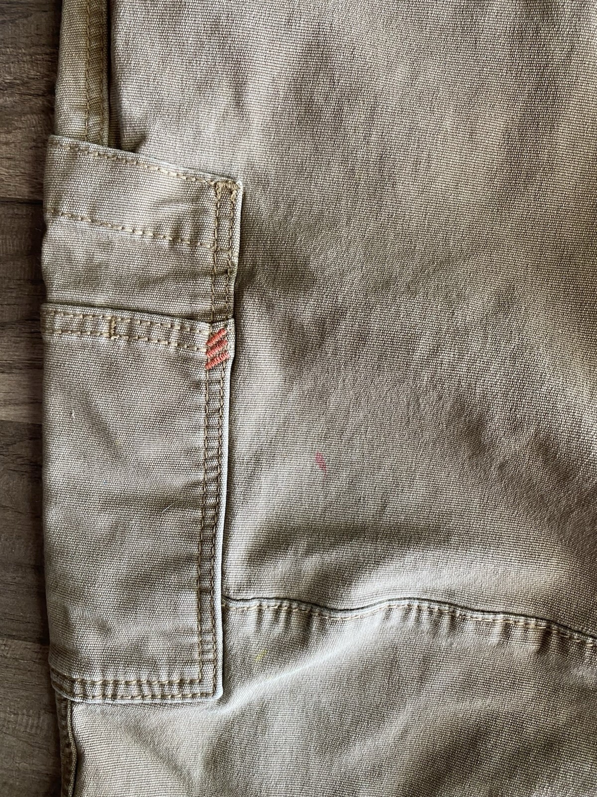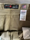 The Ariat FR M5 Pants in size 40x34 and tan color are designed for workwear with a straight leg style and flame-resistant features. Made of a durable blend of nylon, spandex, and cotton in a canvas fabric type, these pants are machine washable and have a mid-rise fit. Good condition, has red paint stain, see pictures.