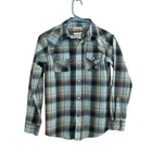 Ariat Habney Retro Snap long sleeve shirt features a classic plaid pattern in shades of blue, tan, and yellow. This Western-style top is designed with a retro fit, pointed yokes, and dual chest pockets with snap closures. The pearlized snap buttons and embroidered logo detail on the pocket add a touch of authentic cowboy style to this durable cotton-blend garment. This item is in good used condition. Keywords: Western, Cowboy, Rodeo, Plaid, Retro, Country, Southwestern, Pearl Snap, Workwear, Ranch, Casual, Habney, Rugged Brand: Ariat Product Type: Button-Up Shirt Style: Western / Retro Fit Sleeve Length: Long Sleeve Closure: Snap Button Pattern: Plaid Color: Blue, Tan, Yellow Material: Cotton Blend Features: Chest Pockets, Pointed Yoke Model: Habney 10043716 Measurements: • Chest (Pit-to-Pit): 17" (34" doubled) All items come from a smoke free, golden retriever dog friendly home. All of items unless NWT or Dry Clean Only are washed with Tide. We try our best to disclose any flaws with items, if we miss something please reach out and let us know.