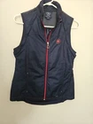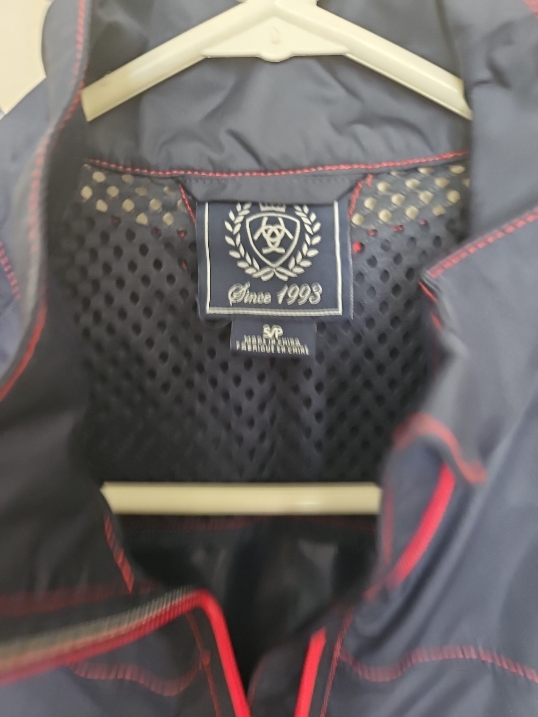 Ariat Lightweight Convertible jacket vest with zipper pockets and red accents. Women's navy blue, small, measures approximately 18x26.