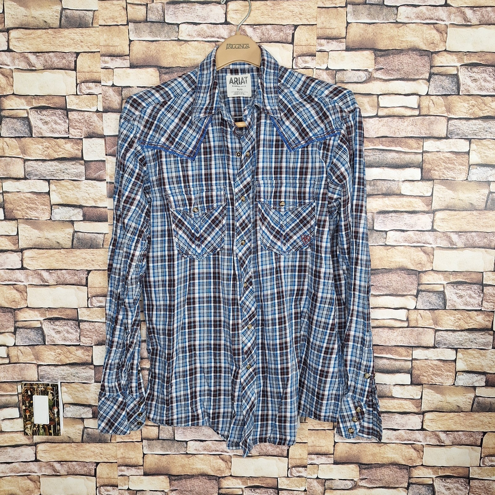 Ariat Long Sleeve Shirt Mens L Multicolor Plaid Pearl Snap Western Quality used condition. Please check out the measurements before buying to ensure a perfect fit. Shirt Size on Label L Shoulder- Hem 25.00'' Shoulder- Shoulder 20.00'' Shoulder- Wrist 24.00'' Armpit- Armpit 23.00'' Everything ships within a day. Spot cleaned according to manufacturer's recommendations. Has a chance of wrinkling in the mail. Feel free to message me with any questions. Thank you very much. 8/7/25