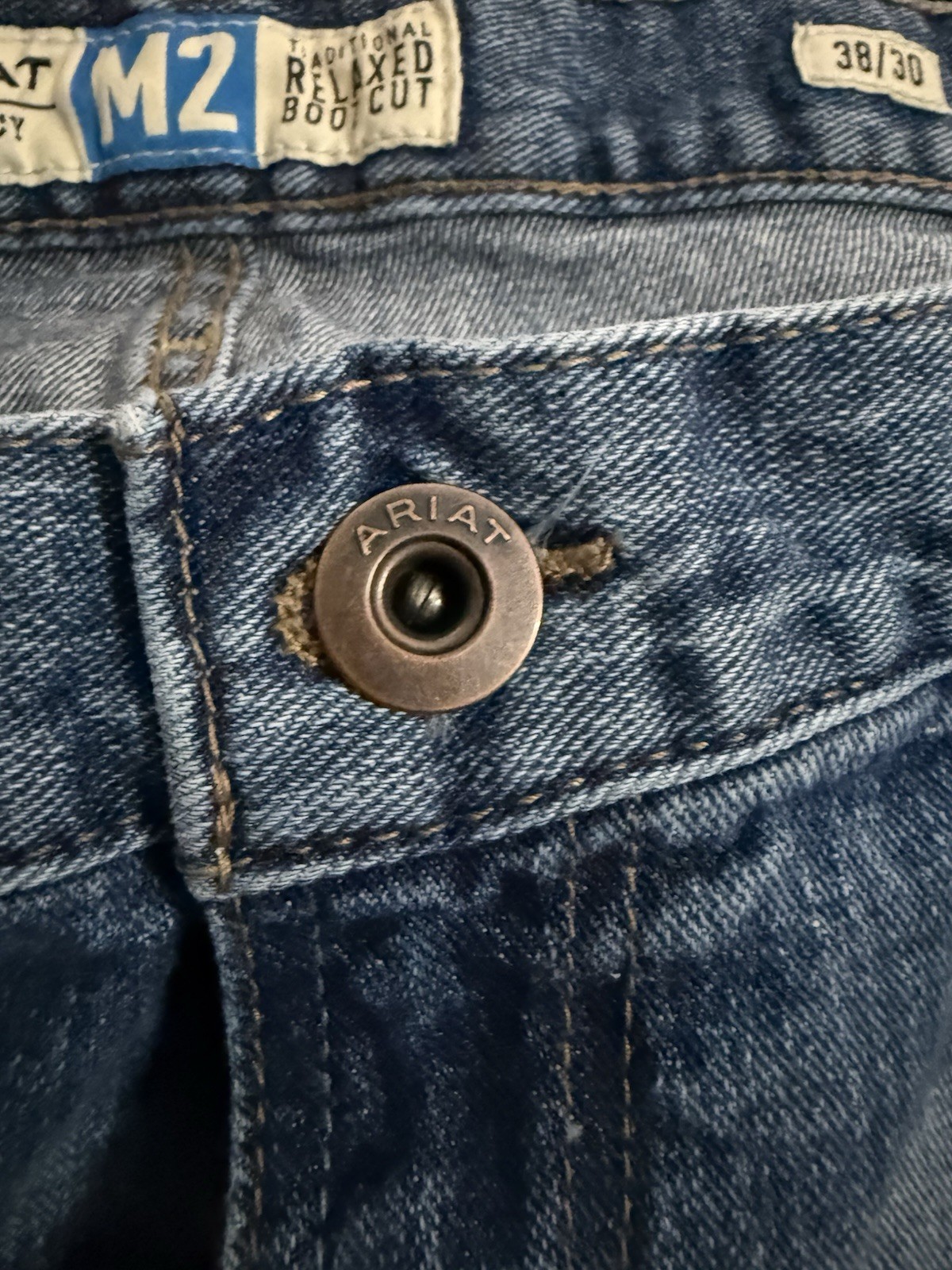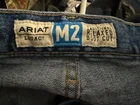 The Ariat Men's Blue Legacy M2 Traditional Relaxed Boot Cut Denim Jeans Pants are designed for comfort and style. Made from denim with a relaxed fit, these pants feature a zip fly and button closure, a 5-pocket design, and a bootcut leg style. With a mid-rise and a 30-inch inseam, these jeans are suitable for all seasons and can be machine washed for easy care. The solid blue color and lack of vintage style make them a versatile wardrobe staple for men who appreciate quality and durability in their clothing choices. Perfect preowned condition. No flaws noted. No stains, rips, tears, stains. Button intact. Zipper works. Hem is in great condition.