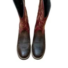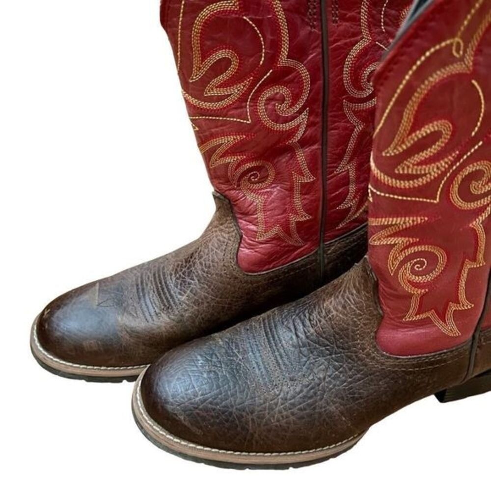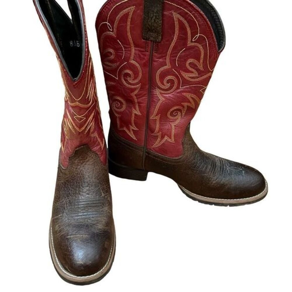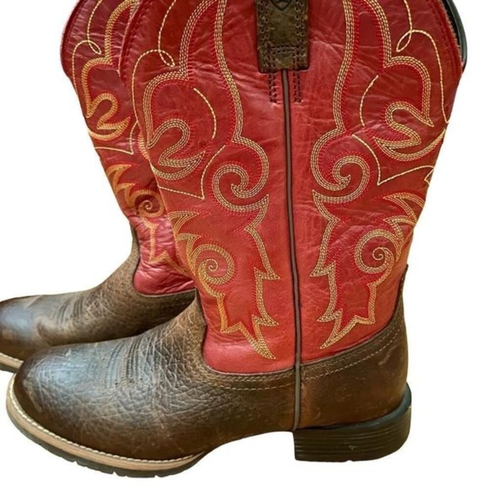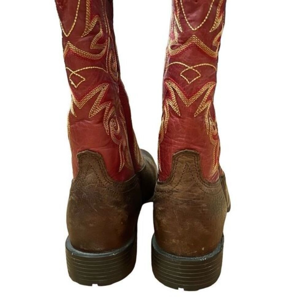 Ariat Red and Brown Leather Hybrid Roper Cowboy Boots — SZ 8.5 Style 10014160 Gorgeous gold contrast stitching on a fabulous pair of red upper Ariats. Comfortable wide, round toe 4LR lightweight stabilizing shank for support Oil and slip resistant Duratread sole Goodyear three quarter welt construction Six-row stitch pattern in red, gold and yellow thread These have very light wear, just gentle scuffing! REASONABLE OFFERS ALWAYS WELCOMED leather, ropers, Ariat, western, cowboy, boots, women's, men's, style, comfort, full-grain, Duratread, horseman heel, round toe, casual, work, ranch, riding, walking, and fashion INV RRP55 #country #western #cowgirl #red #leather #rubbersoles #Ariat #roper
