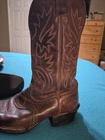 This product is a pair of whiskey brown leather men's Ariat boots in size 11 with square toe. Style is western /cowboy The stitching is a light tan/champagne color alongside a copper shade. Very pretty but masculine. These boots show typical wear and have no major visible damage to mention. Please inspect ALL photos beofre purchasing. Made from high-quality leather, they offer both style and durability. Perfect for any casual or outdoor outfit, these boots are a versatile addition to any man's wardrobe.