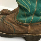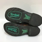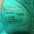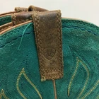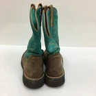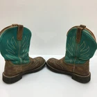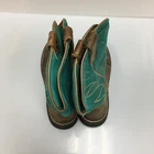 Ariat Boots Womens Size 7.5B Brown Turquoise Leather Western Cowboy 10014081 Condition: Fair used condition with moderate wear—scuffing and surface marks visible on leather, creasing on vamps, and dirt from previous use as shown in photos. No rips or major structural damage. Please review photos for details. Features brown leather foot with turquoise blue shaft and Western-style gold/yellow decorative stitching Round/square toe with double stitching at welt, pull tabs with Ariat logo Duratread green-accent rubber outsoles with Ariat branding and logo Brand: Ariat Style: 10014081 (as shown on inner label) Tag size: US 7.5B (Womens); UK 5M; EU 38M Leather upper, balance manmade Made in China (country of origin not included in title) Classic Western/cowgirl rodeo style boots—perfect for casual, ranch, or riding wear Please see all photos for close-up details and signs of use