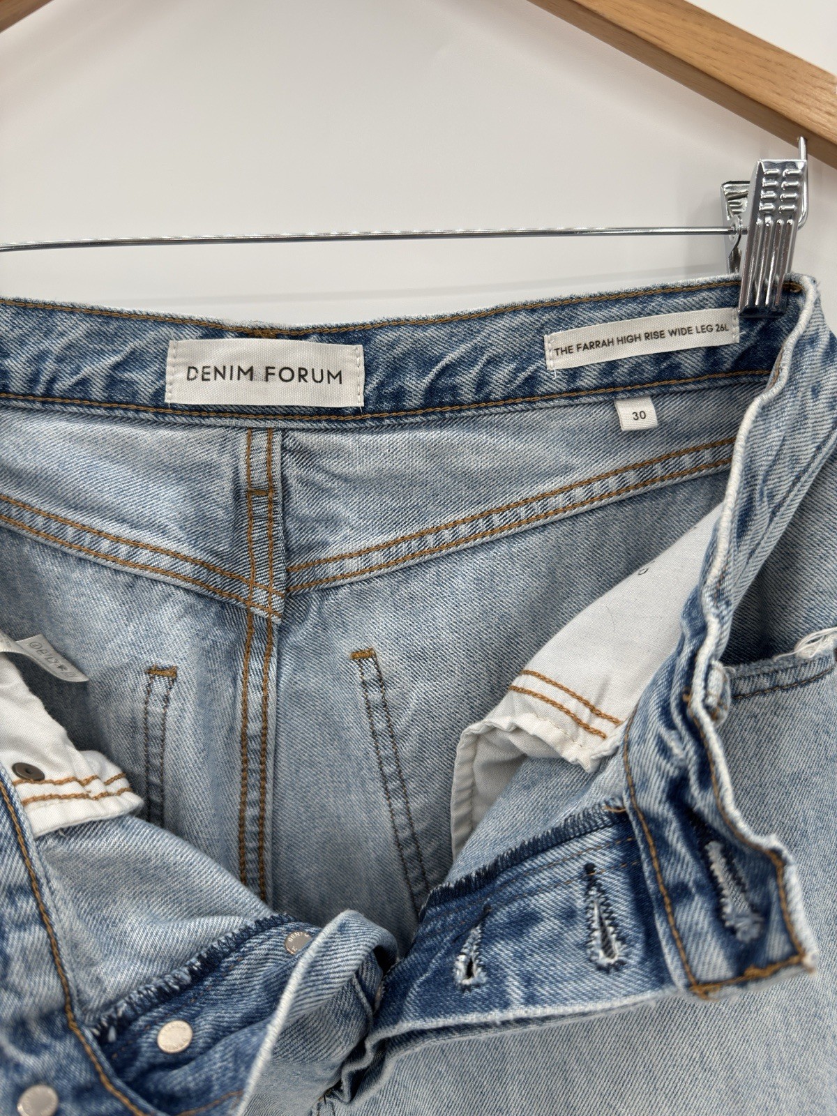The Aritzia Denim Forum Women's Size 30 The Farrah High Rise Wide Leg Jeans are a stylish and versatile addition to any wardrobe. These jeans feature a high-rise waist and a wide-leg fit, flattering the figure and providing a comfortable and relaxed feel. Made from 100% organic cotton denim, they are perfect for the spring and summer seasons. The cropped length and 5-pocket design add to the modern and bohemian look of these light wash jeans. With a button closure and subtle logo accents, these jeans are a chic and sustainable choice for any fashion-conscious woman.