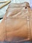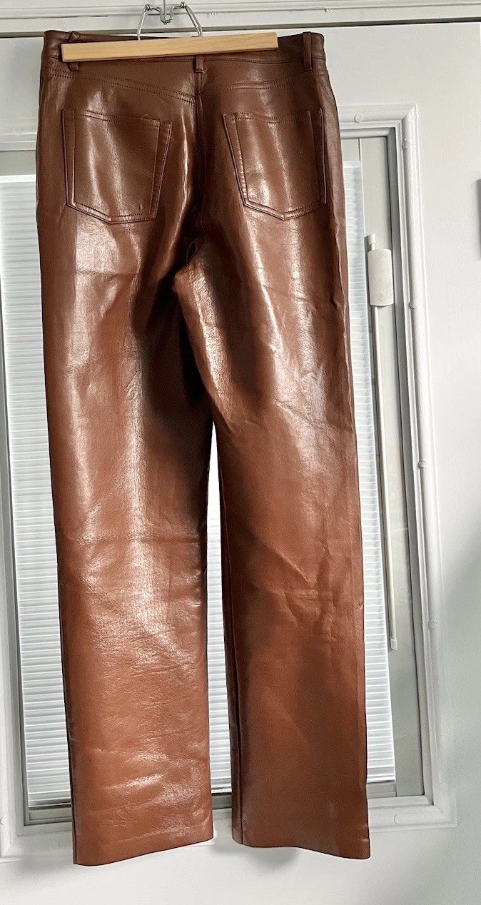 The Aritzia Wilfred Melina Vegan Leather Straight Leg Pants in Brown Cognac Size S are stylish and versatile dress pants perfect for various occasions such as casual, business, or travel. Made from faux leather, these pants have a high rise and a flat front design with a zip and button closure. The classic straight leg style and solid brown color make them a wardrobe essential for the winter, fall, and spring seasons. With pockets for functionality, these pants offer a comfortable and fashionable fit for the modern woman.