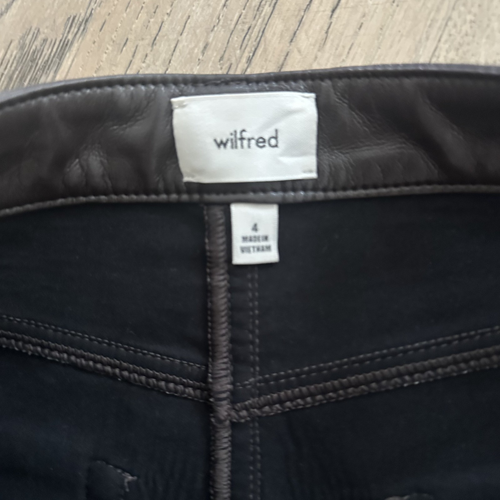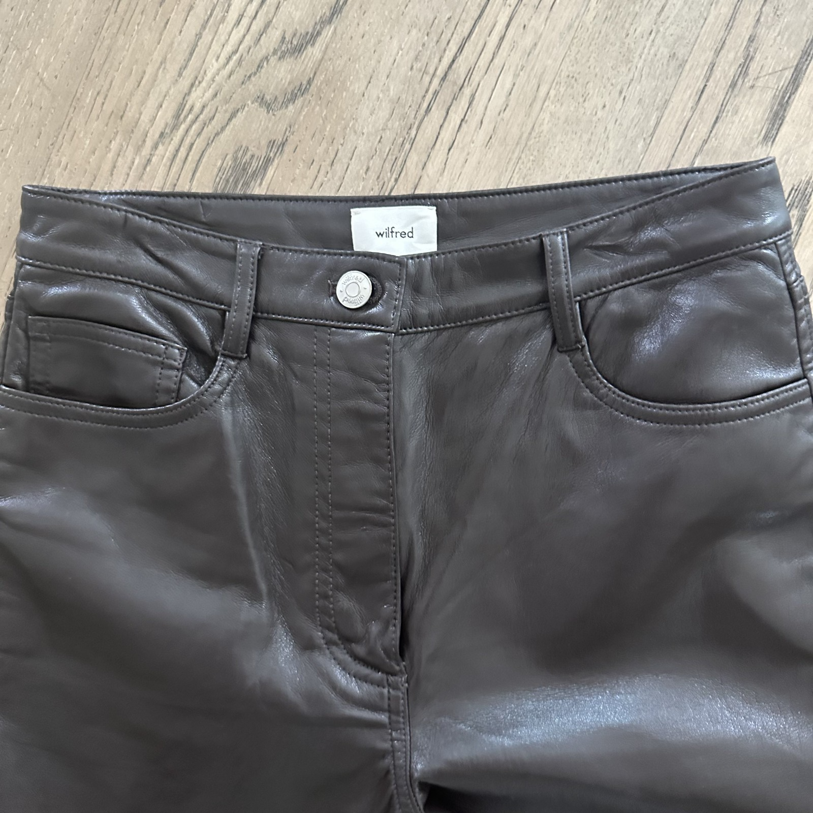 Features:PocketsDepartment:WomenFront Type:Flat FrontSize:4Fit:RegularSeller Notes:“No holes or stains. Loose thread in the very last photo”Color:Chocolate & CognacGarment Care:Machine WashableOccasion:Business, Casual, TravelWaist Size:28 inRise:High (Greater than 10.5 in)Brand:WilfredSeason:Fall, Spring, WinterType:PantsTheme:ClassicSize Type:RegularPattern:SolidStyle:Dress PantsAccents:ButtonCountry of Origin:ChinaInseam:30 inLeg Style:StraightMaterial:Faux Leather, LeatherClosure:Button, Zip