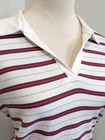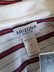 Modern striped cropped polo-style shirt by Arizona. Features a red, white, and blue ribbed stripe pattern, v-neck with a white collar, and a soft lightweight fabric with some stretch. Pullover style with no closure and no pockets. Great for casual summer styling or Y2K-inspired looks. Item Details: • Size: Tagged Juniors Large • Pit to Pit: 18" • Length: 18" • Condition: Excellent pre-owned condition • Material: Polyester-rayon blend • Fit: Cropped, form-fitting • Stretch: Some • Closure: Pullover • Pockets: None • Brand: Arizona Cute paired with high-waisted denim, cargo skirts, or layered under overalls. Ships fast and packed with care.