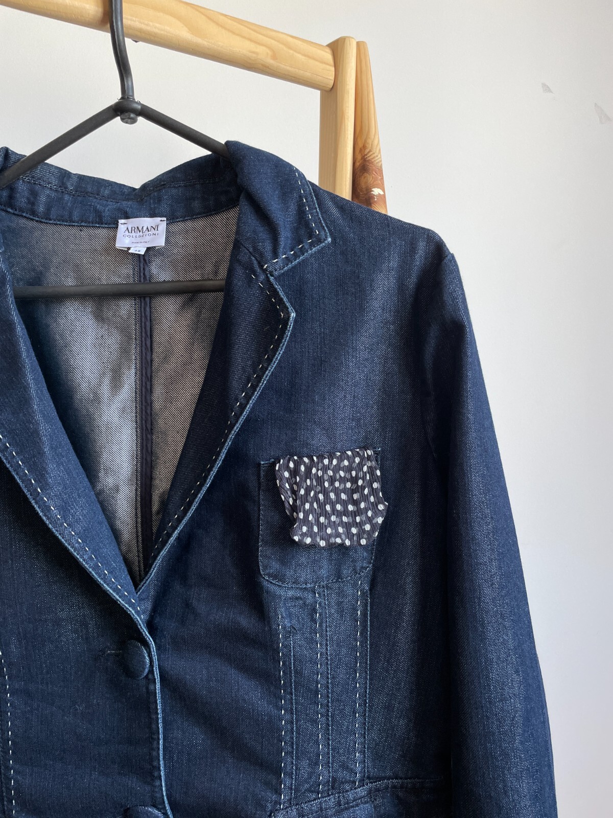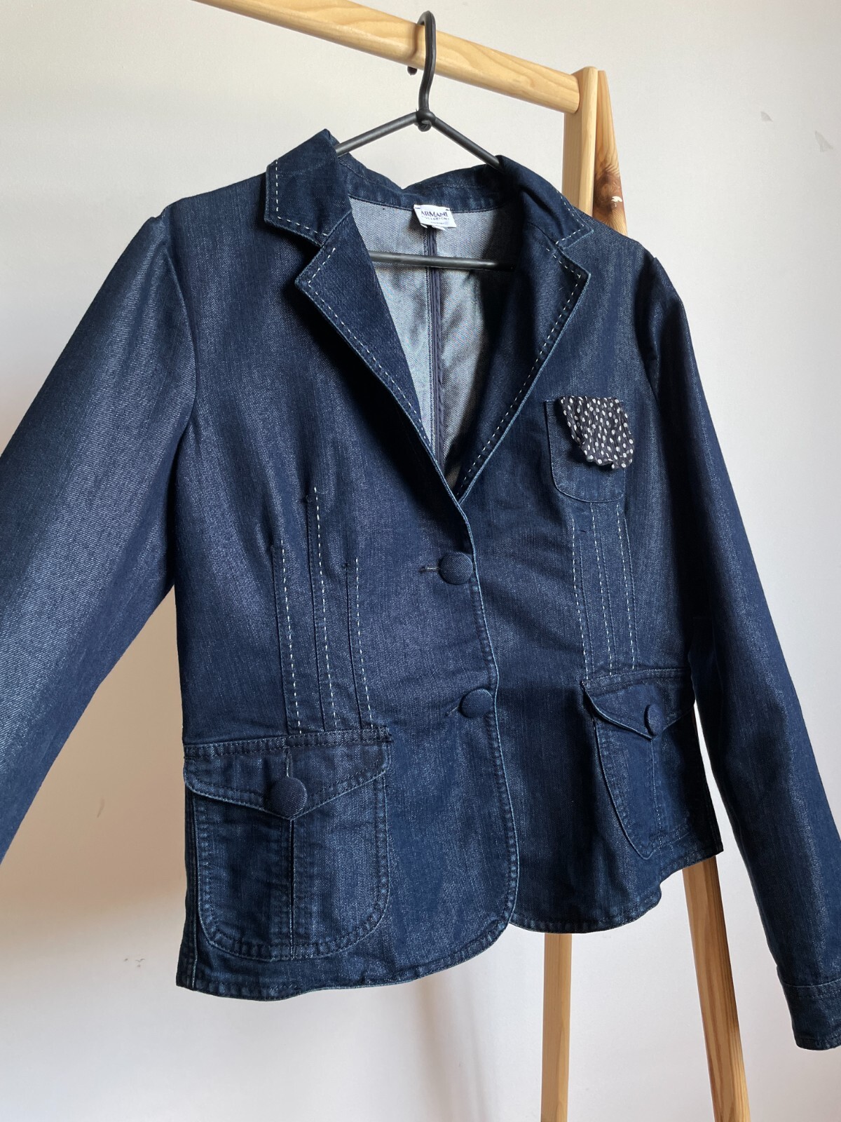 Armani Collezioni Womens Denim Blazer Excellent pre-owned condition Size IT 48 Measures: Shoulders 44 cm/ 17.3 in Pit to pit 52 cm/ 20.4 in Sleeve from shoulder 67 cm/ 26.3 in Length in back 56 cm/ 22 in + collar All items are measured laying flat