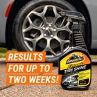 Product Description Armor All Extreme Tire Shine, Tire Cleaner and Black Shine, Trigger Spray, 22 Ounce (Pack Of 1) Armor All, 22 OZ, Extreme Tire Shine, Extra Gloss Enhancers For Intense, Smooth, Even Shine Conditions, Nourishes, & Preserves Your Tires Rich Black Look, Precision Applicator Provides Smooth, Even Shine Without Messy Over Spray, Protects From Harmful Elements That Can Cause Cracking & Fading, 1 Step, Easy Application, No Wiping, Trigger Spray. Armor All Extreme Tire Shine Spray gives your tires an extreme shine finish with an easy-to-use spray application. Made with a proprietary Shine-Shield formula featuring extra gloss enhancers, this tire protectant spray gives your tires an intense mirror-like shine with a rich black appearance to keep them looking like new. Conditioners fortify the tire protection spray to protect and nourish your tires, preserving their natural beauty with car care products that are easy to apply. The tire conditioner prevents cracking and fading caused by harmful elements to make your tires last longer and look better. 22 oz bottle of Armor All Extreme Tire Shine Spray Tire protection spray offers smooth and even application for extreme shine Easy-to-use car care products use extra gloss enhancers for tire conditioner with mirror-like shine Tire spray fortified with conditioners to protect and nourish tires for a deep black color Extra gloss enhancers for intense, mirror-like shine Conditions, nourishes, and preserves your tires' rich Black look Protects from harmful elements that can cause Cracking and fading Fit type: Universal Fit Tire protectant spray prevents cracking and fading Simply spray onto clean, dry tires and allow spray to dry for instant extreme shine Armor All tire shine results last for weeks Product Type - AUTO ACCESSORY Indications FIRST AID: INGESTION: DO NOT INDUCE VOMITING. Get prompt medical attention. EYE CONTACT: Remove contact lenses. Immediately flush eyes thoroughly with plenty of water for 15 minutes. Get medical attention. SKIN CONTACT: Remove contaminated clothing. Wash area with soap and water. If irritation persists, get medical attention. INHALATION: Remove to fresh air. If breathing problems or irritation persist, get medical attention.