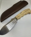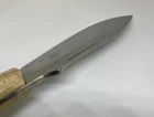 The Arno Bernard Hippo Giant Fixed Blade Hunting Skinner Knife is a handmade hunting knife designed by the brand Arno Bernard in South Africa. The blade is made of N690 stainless steel with a full tang construction, making it durable for hunting tasks. The handle is crafted from bone material, giving it a traditional and rustic look. With a blade length between 4.1 to 5 inches, this knife is suitable for skinning and other hunting needs. Its ambidextrous design allows for easy handling by both left and right-handed users.