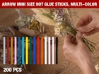 Product Description 200 Pack Mini Hot Glue Sticks : This pack contains 200 mini hot glue sticks, each measuring 4" in length and 5/16" in diameter. You'll have plenty of glue sticks to tackle all your crafting and DIY projects. High-quality Materials : Our glue sticks are made from premium EVA and resin materials, ensuring they are safe, non-toxic, and environmentally friendly. They are suitable for both adults and children to use without any harm. You can trust their quality for long-lasting results. Impressive Using Performance : These glue sticks offer excellent melting and flow properties, making them easy to use and providing smooth application. Say goodbye to messy and uneven glue lines! They are free from impurities and bubbles, dry quickly, and provide excellent waterproof and corrosion-resistant properties. Extra-strong Bond : With a higher EVA content compared to traditional glue sticks, our product delivers an extra-strong bond. It ensures that your projects stay securely in place, whether you're working with paper, fabric, wood, or other materials.With their superior adhesive properties, these glue sticks create a strong and reliable bond on various surfaces, including paper, fabric, wood, plastic, and more. Your projects will stay intact! Multi-colored : There are a total of 15 colors of colored glue gun sticks, including 20 sticks of each pearlescent color(gold, gray, pink, red, sea blue) and 10 sticks of each ordinary color(black, white, yellow, orange, red, purple, sky blue, sea blue, green, pink) to meet different needs.