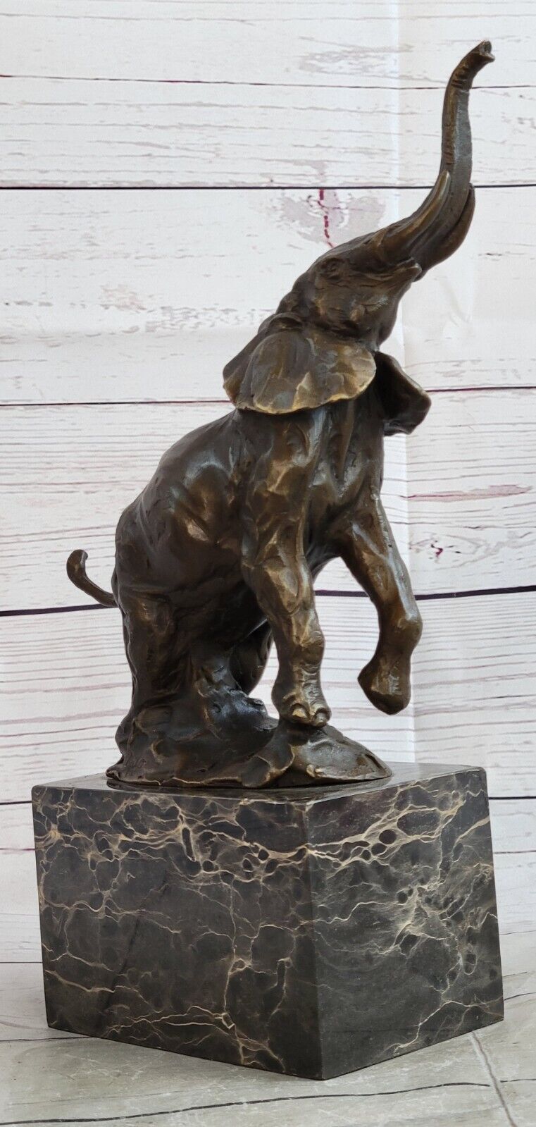 Art Deco Wildlife Elephant by Milo Bronze Hot Cast Sculpture Statue Artwork Deco Art Deco Wildlife Elephant by Milo Bronze Hot Cast Sculpture Statue Artwork Deco Condition : This sculpture is in perfect condition Bronze Dimensions with Marble Base: Height 12" X Width 10" Marble Dimensions:5" X 3" Height without base:9" Weight10 LBS Inventory:53K2734335 Immerse yourself in the mesmerizing presence of the bronze elephant sculpture, a piece that captures the essence of this majestic creature's slow and graceful journey across an arid plain. With its trunk gently arched upwards and outwards, the elephant portrays a tranquil demeanor as it moves, reflecting the serene nature of its gaze. Throughout history, elephants have held sacred significance, representing strength and wisdom across different cultures. In Eastern cultures, they embody patience and energy, while in Hinduism, the deity Ganesha with an elephant's head symbolizes intellect and spirituality. Crafted using the timeless technique of lost-wax casting, this bronze sculpture exudes authenticity and detail in every curve and contour. The brown patina finish further enhances the sculpture's rich and enduring character, adding to its visual appeal. Mounted upon a variegated brown marble base, the elephant stands as a symbol of power and grace, ready to bring a touch of the wild and the sacred to any environment it graces. Artist Milo's signature ensures the sculpture's authenticity, making it a remarkable addition to any collection or a thoughtful gift that carries the profound symbolism of the elephant's presence. Bronze Sculpture Hand Made Statue Art Nouveau Signed Milo Abstract Elephant Video will open in a new window Using the eBay App? Paste link into a browser window: [isdntekvideo] Shipping Terms : Most of our items are shipped via USPS (United States Postal Service) mail or UPS. Most orders are shipped within 24-48 hours of purchase. Please be aware that not all items are available for USPS shipping due to size and weight. We do ship to Hawaii, Alaska, Canada, Puerto Rico, APO/AE, and U.S. Virgin Islands, however, an additional charge may be required. Please contact us before making any purchases in these areas. For Non-USA customers, you may be responsible for all duty, tax, brokerage fees that may be due upon delivery (shipping costs cover freight charges only). We also ship internationally. Please refer to the "Shipping and Handling" chart for the rates for each area. Payment : We accept just about any form of payment. PayPal, Master Card, Visa or American Express credit cards. Money orders, cashiers checks, and even personal or business checks. For governmental institutions, we will also accept a purchase order. Please understand that for personal or business checks we have to wait for the check to clear (usually 7 days) before shipping. Condition : New Detailed Hand Crafted Hot Cast Bronze Satisfaction Guaranteed. This is Stock Photo, Slight Color Variation!! Listing and template services provided by inkFrog