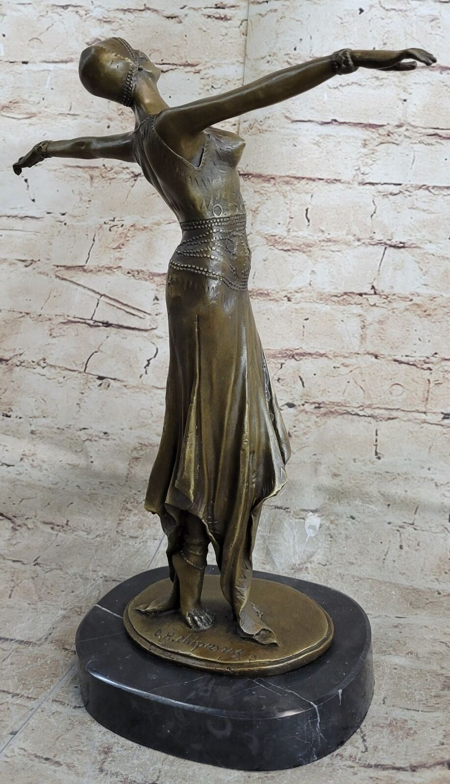 Condition : This sculpture is in perfect condition. Bronze Dimensions with Marble Base: Height 15" x Width 12" Marble Dimensions: Diameter 7" Height without base:14" Weight:11 LBS Inventory:45Y2274754 Marvel at the captivating beauty of the "Admirable Dancer," a stunning bronze sculpture that immortalizes the grace and artistry of a dancer in a mesmerizing pose. This exquisite artwork captures the essence of the dancer's performance as she balances gracefully on her toes, extending her arms in a second position with a graceful tilt of her head. Dressed in a Russian dance costume that accentuates her figure, the dancer becomes a vision of artistic movement frozen in time. The intricate details of the costume and the poised stance showcase the artist's dedication to capturing the beauty and fluidity of dance. Crafted with precision, the sculpture is a testament to the skillful use of the lost wax method, a traditional technique that allows for intricate detailing and ensures the authenticity of the artwork. Resting on a sleek black marble base, the sculpture not only adds a touch of elegance but also enhances the visual impact of the artwork. The piece is signed by D.H. Chiparus, a renowned artist known for his exceptional sculptures that often depict dancers and figures in dynamic poses. Ideal for art enthusiasts and those who appreciate the expressive beauty of dance, the "Admirable Dancer" brings a sense of movement and sophistication to any space. Bronze Sculpture D.H. Chiparus Dancer Standing On Her Toes Bronze Sculpture Deco \ Video will open in a new window Using the eBay App? Paste link into a browser window: [isdntekvideo]