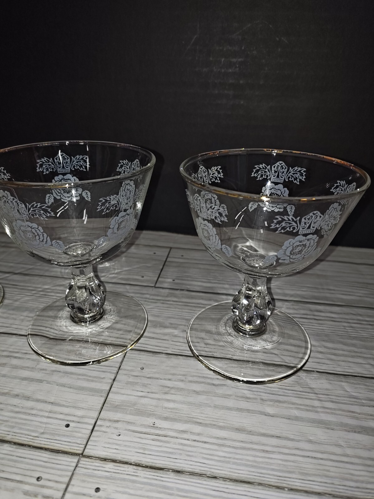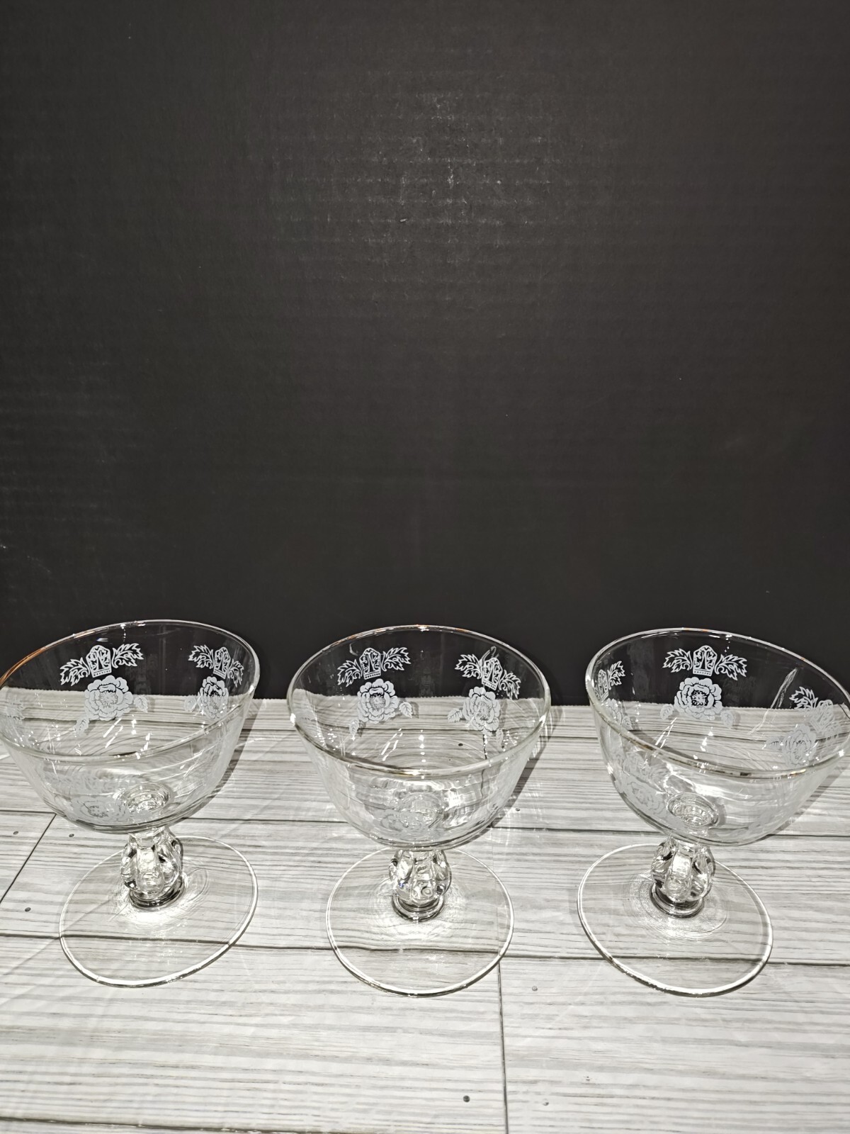 Art Nouveau Floral Design Glass Champagne Sherbet Coupe Goblets Set of 3. Has wear from age use and storage. See pictures. Sold as is.