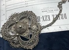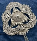 -up for sale is an intricately designed filigree, Arabic Persian Islamic Middle Eastern star statement necklace -the necklace and chain are set in sterling silver and testa such in the pictures. -it has a trombone clasp on the back if you decide to wear it as a brooch and the chain is soldered together and also set in sterling. Measuring 26 to 27 inches in length. -the medallion is 3 1/4 inch and diameter. -the necklace and medallion weigh a total of 62.9 g or 2.2 ounces it’s a very significant heavy necklace -I’m not sure what the Arabic signs were writing is on the necklace -they are beautiful shapes such as circular triangle, and like an infinity or other significant meaning -there is a marking on the pin of the medallion approach. I think it’s an Arabic. I’m not able to read it. -the trumpet clasp helps to date the peace. It may have a little looseness as far as staying closed. -it is in good shape otherwise and eye clean it is an artisan handmade piece so it won’t be perfect and that’s what makes it so special  ——————————————————— ****eBay notes to buyers**** -please view all pictures, as I have taken detailed photographs with measurements, and/or weights, close-ups to view any flaws or wear to the item, to show if the item is signed or stamped, and to provide as many details as possible for your viewing before purchase. -please note that I am not a professional jeweler, this is a hobby for me, and I try to do my very best to research items to the best of my ability. If you have any questions or concerns, please feel free to reach out to me with a message and I will try and answer questions. -items will come as is, as many are vintage, pre-worn, or have come in a lot or auction. -items that are new, new old stock, in original package or box, etc. will have details listed to the best of my ability, especially as I can’t take some items out of original packaging. If items come with a box or card, I will mention it otherwise they do not come with any original packaging. -please feel free to look at my other listings and I can try to combine shipping when possible, depending on the weight of the items. I will work with you as best as I can