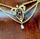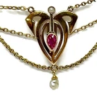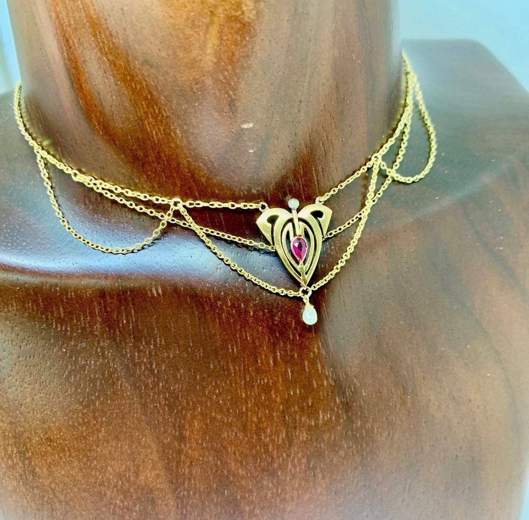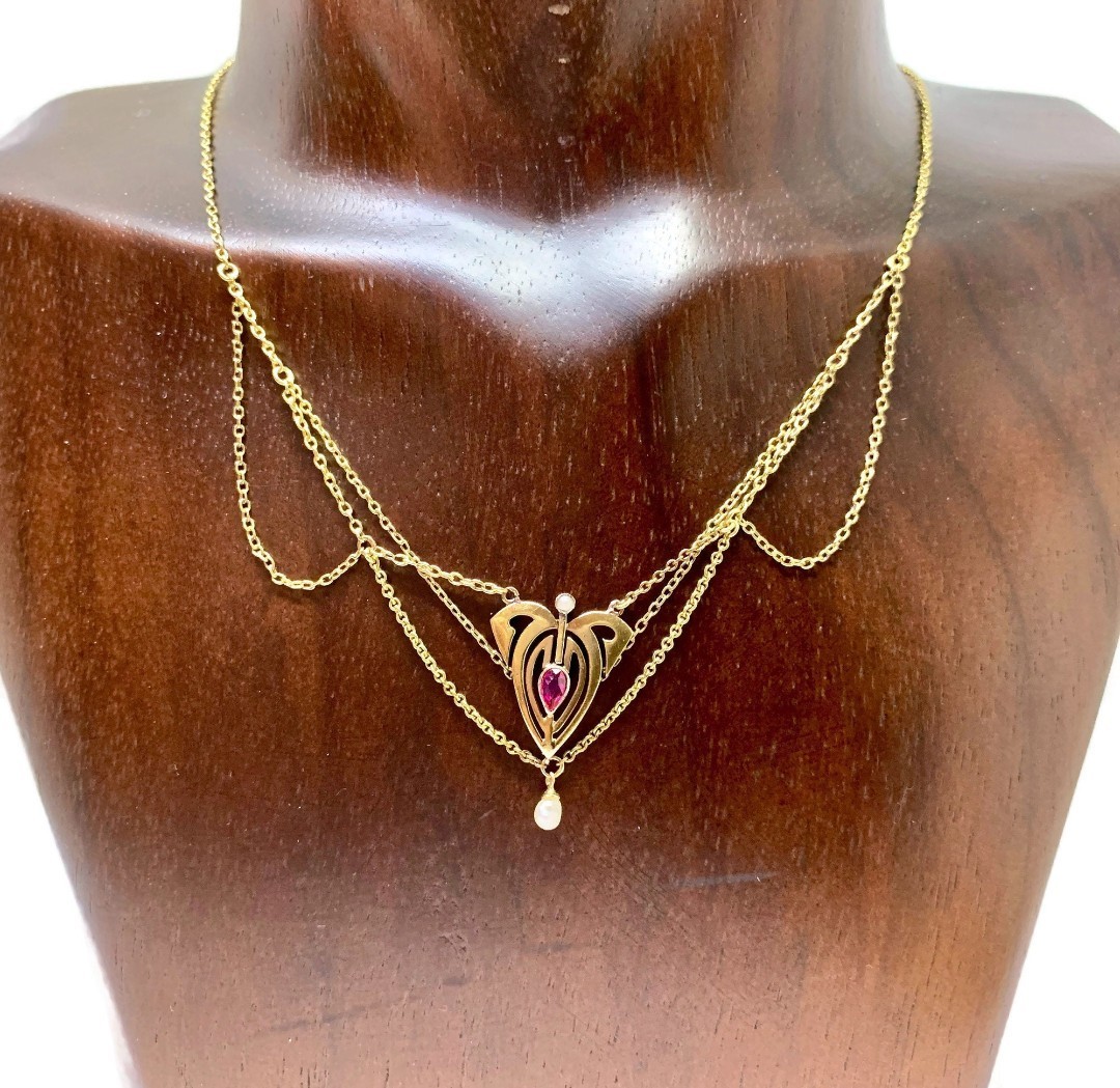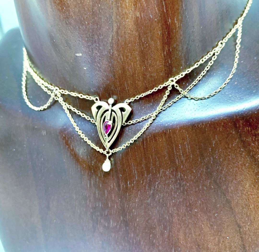 Jugendsil collar necklace with one pear lab created ruby. The pearls themselves have not been tested but by looking at them we can assume they are two freshwater pearls. From the Art nouveau period 1900-1910 approximately, solid 14k gold acid tested by a goldsmith, Stamped 585. Pendant length: 2.5mm Chain length: 43cm or 16.93inches In good condition, clasp works great and no repairs have ever been needed to the necklace.