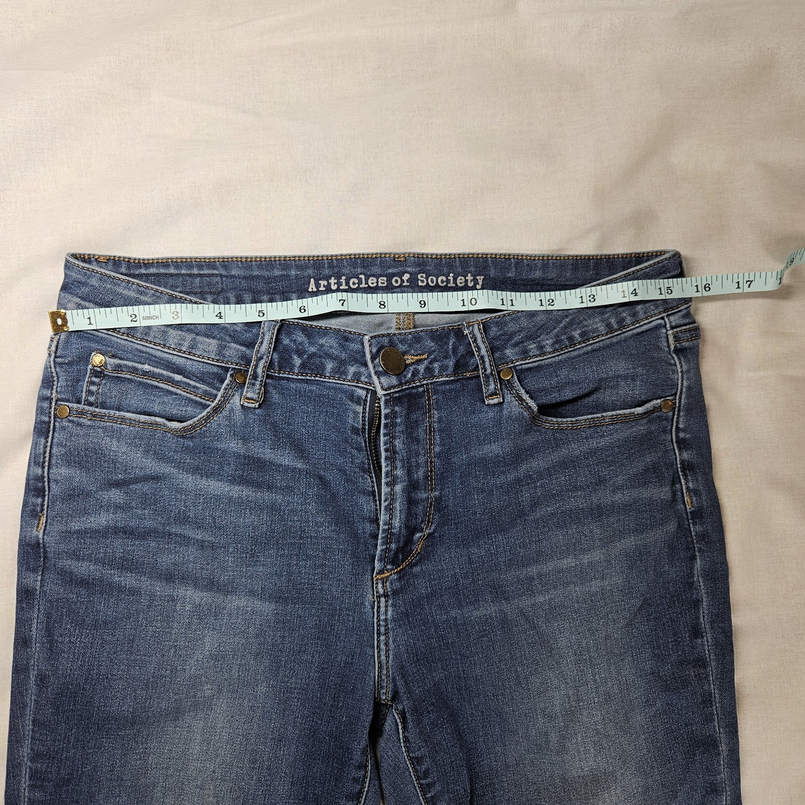 The Articles of Society Women's 30 Blue Denim Skinny Stretch Jeans are a fashionable and versatile addition to any wardrobe. Made from a comfortable cotton blend fabric with a medium wash, these jeans feature a zip closure and a mid-rise fit. The skinny style and 5-pocket design offer a flattering silhouette, while the stretch feature ensures a comfortable and flexible fit. Perfect for the winter and spring seasons, these jeans can be easily machine washed for convenient care. Whether paired with a casual top or dressed up for a night out, these jeans from Articles of Society are sure to become a staple in your closet.
