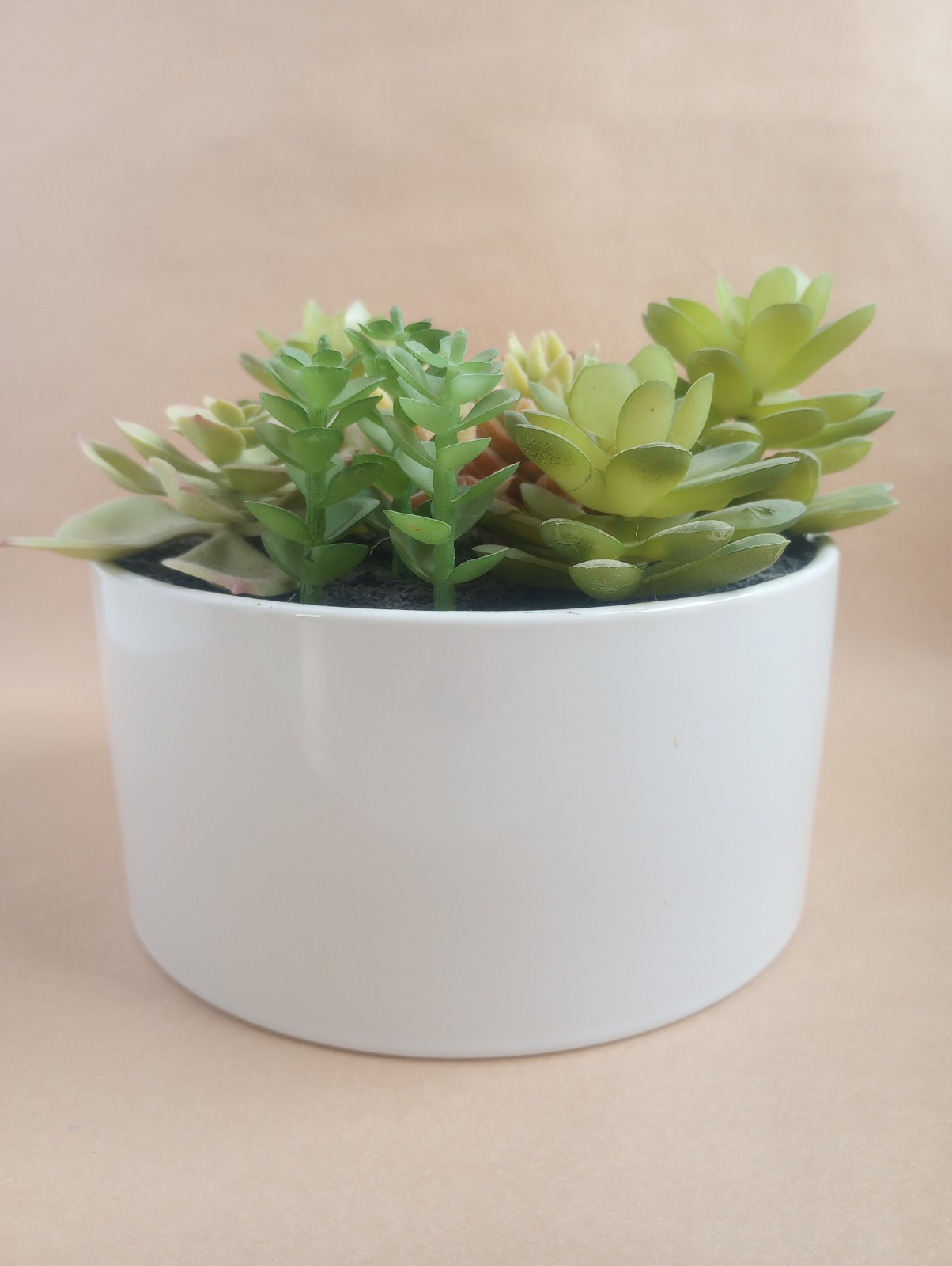 Features faux potted succulents, making it a popular choice for home and garden décor. Adds a touch of greenery to any space while being low maintenance as it requires no watering or pruning. The sleek white planter complements the succulents, creating a stylish and modern display for any room in the house. Please review the photos and note that there is a small blemish on the planter. Otherwise in great shape. Looks real and has fooled many into thinking I have a green thumb. Planter is 7 in wide and 3 1/2 in tall. Overall height is 6 in. ALL OFFERS are reviewed and receive a response.
