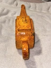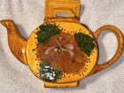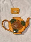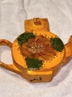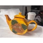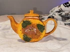 Orange teapot. But more it was somebody's work of art. Beautiful bright sunshine orange. Lovely floral design on sides. No flaws. No chips or cracks. Comes with lid. Signed underneath. 8" tall. 11" at widest.