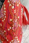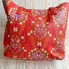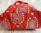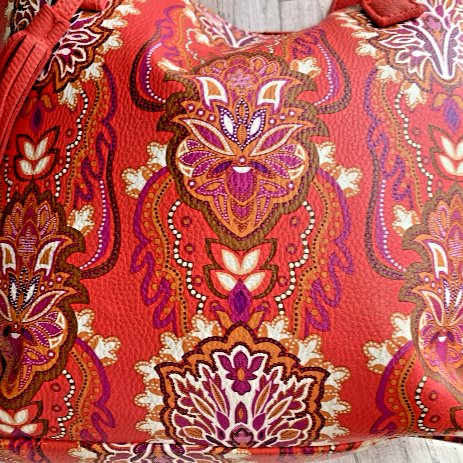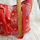 This vibrant artisan-style tote bag features a bold red faux leather exterior with intricate paisley style floral detailing in rich shades of purple, pink, orange, and white. The symmetrical design and decorative tassel add a luxurious touch, while the sturdy red handles ensure durability. The interior is fully lined, making it ideal for everyday use or as a standout accessory. Please note: there is a small tear on the bottom of the bag and a few spots on the liner, as shown in photos. See photos for condition and measurements. Offers happily considered. 🔑 Keywords boho tote, paisley handbag, faux leather purse, artisan bag, red floral tote, lined shoulder bag, women's fashion accessory, casual chic bag, statement tote, vintage-inspired purse